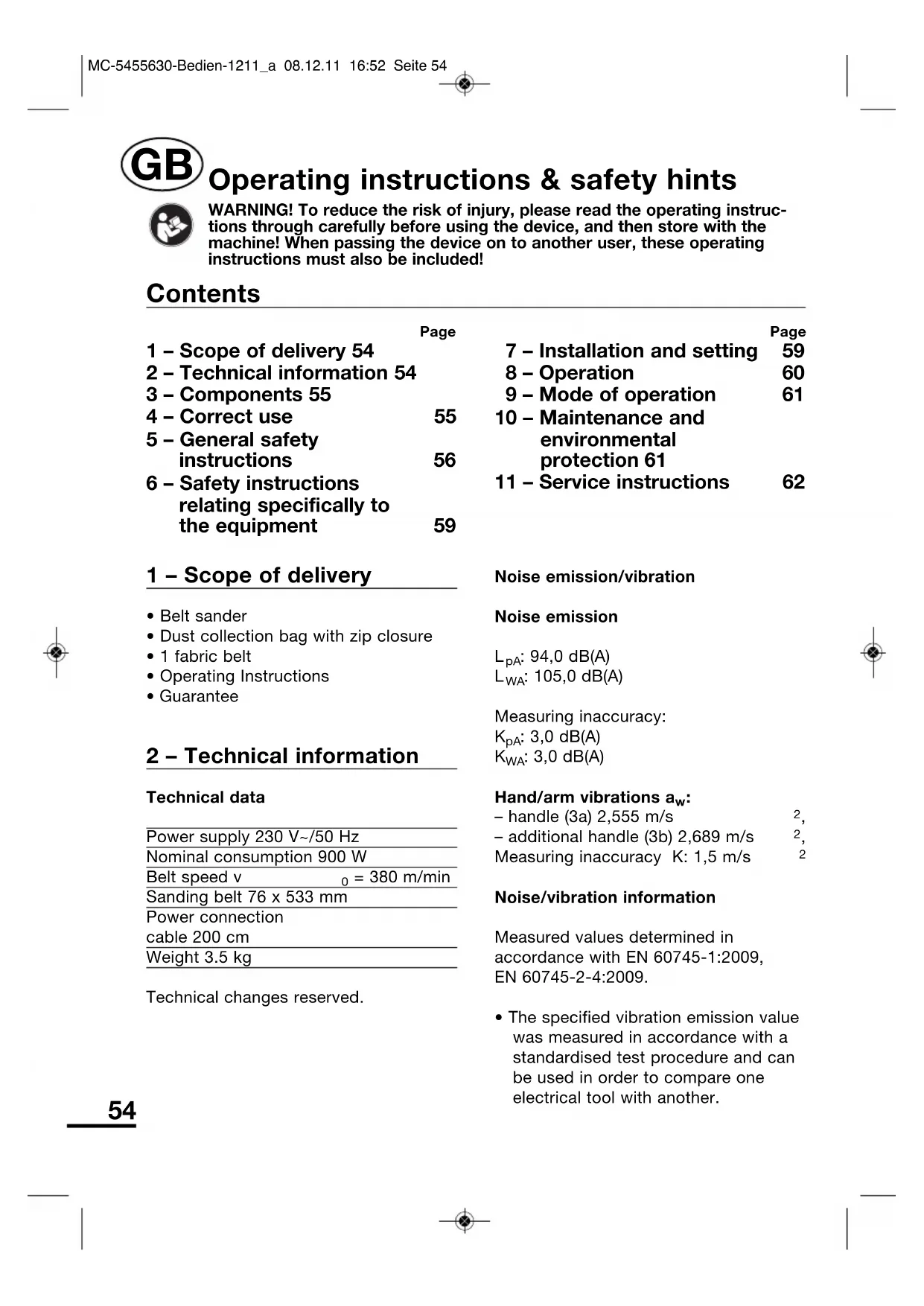| 4 – Correct use | 55 | 10 – Maintenance and environmental protection 61 | |