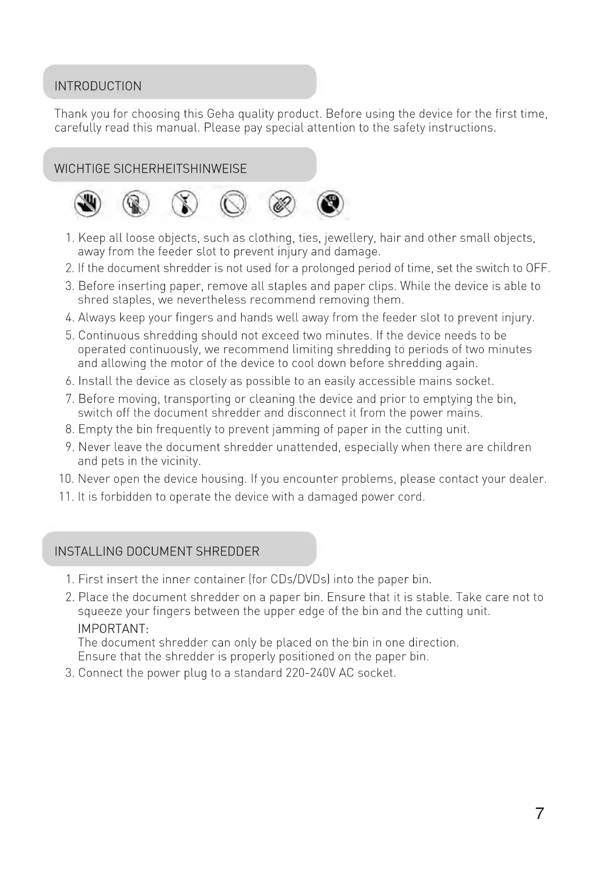 to AUTO. TECHNICAL DATA Model: Shredder X7 CD Cutting type: Cross-cutting Cutting performance: 4 x 40 mm (paper), 4 pieces (CDs/DVDs and credit cards) Shredding capacity: 7 sheets (A4, 70g/m²), 1 CD/DVD or credit card Feed width: 220mm Feed width for CDs/DVDs: 120mm Rated voltage: 220-240VAC/50Hz, 0.8 A Dimensions: 330 x 200 x 430 mm Paper bin: 18 litres Short time operation: 2 minutes DISPOSAL The waste bin symbol indicates that electrical devices must not be disposed of with normal household waste. Please take your device to a collection centre for electrical appliances for recycling and proper disposal. WARRANTY The warranty period for your device is 24 months. For warranty claims, you need your sales receipt. Please also keep the original packaging. If you encounter any problems with your document shredder, please contact your dealer. Manual__X7CDComfort:Layout 1 07.09.10 16:43 Seite 910 INTRODUZIONE La ringraziamo per aver acquistato questo prodotto di qualità Geha. La preghiamo di leggere attentamente questa guida prima dell'utilizzo, rivolgendo particolare attenzione alle indicazioni di sicurezza.