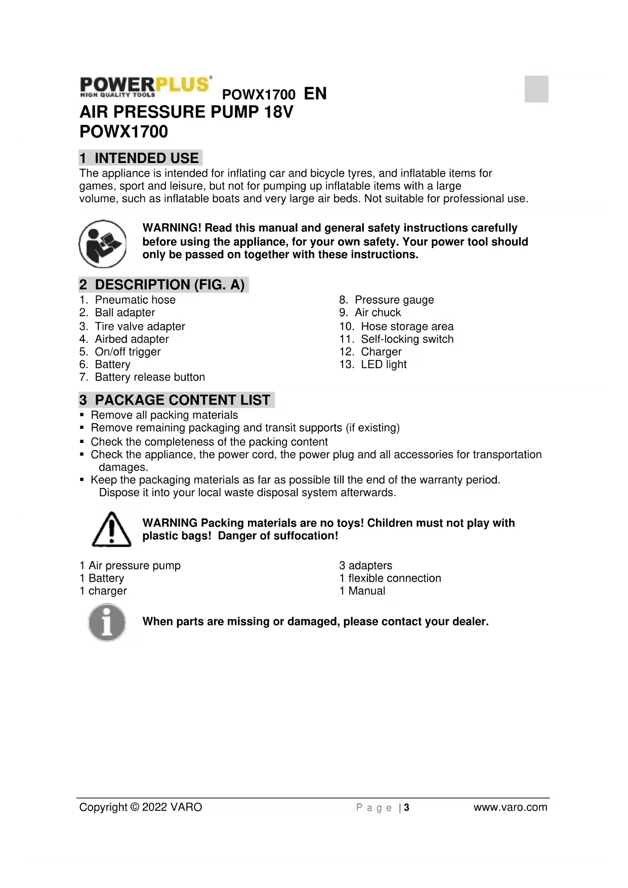 - Keep the packaging materials as far as possible till the end of the warranty period. Dispose it into your local waste disposal system afterwards. WARNING Packing materials are no toys! Children must not play with plastic bags! Danger of suffocation! 1 Air pressure pump 1 Battery 1 charger 3 adapters 1 flexible connection 1 Manual When parts are missing or damaged, please contact your dealer.POWX1700 EN Copyright © 2022 VARO P a g e | 4 www.varo.com 4 SYMBOLS In this manual and/or on the machine the following symbols are used: