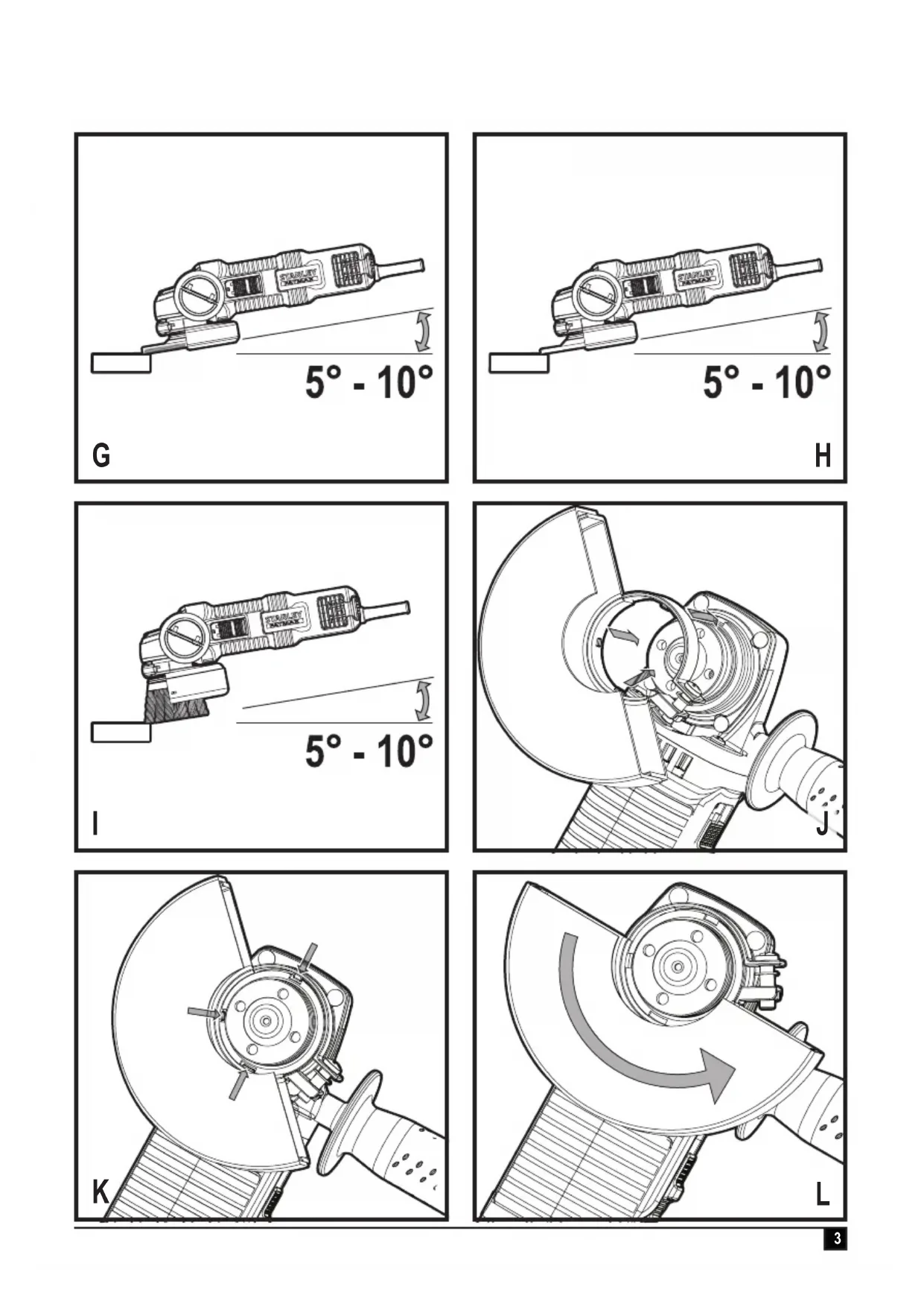 ENGLISH (Original instructions) u NO EATING, DRINKING or SMOKING should be done in the work area to prevent ingesting contaminated paint particles. Workers should wash and clean up BEFORE eating, drinking or smoking. Articles of food, drink, or smoking should not be left in the work area where dust would settle on them. u Paint should be removed in such a manner as to minimize the amount of dust generated. u Areas where paint removal is occurring should be sealed with plastic sheeting of 4 mils thickness. u Sanding should be done in a manner to reduce tracking of paint dust outside the work area. u All surfaces in the work area should be vacuumed and thoroughly cleaned daily for the duration of the sanding project. Vacuum lter bags should be changed frequently. u Plastic drop cloths should be gathered up and disposed of along with any dust chips or other removal debris. They should be placed in sealed refuse receptacles and disposed of through regular trash pick-up procedures. During clean up, children and pregnant women should be kept away from the immediate work area. u All toys, washable furniture and utensils used by children should be washed thoroughly before being used again. Fitting and using wire brushes and wire wheels Wire cup brushes or wire wheels screw directly on the grinder spindle without the use of anges. b. A Type 27 guard is required when using wire brushes and wheels. Wear work gloves when handling wire brushes and wheels. They can become sharp. Wheel or brush must not touch guard when mounted or while in use. Undetectable damage could occur to the accessory, causing wires to fragment from accessory wheel or cup. u Thread the wheel on the spindle by hand. u Depress spindle lock button and use a wrench on the hub of the wire wheel or brush to tighten the wheel. u To remove the wheel, reverse the above procedure. Warning! Failure to properly seat the wheel hub before turning the tool on may result in damage to tool or wheel. Wire wheels and brushes can be used for removing rust, scale and paint, and for smoothing irregular surfaces. Note: The same precautions should be taken when wire brushing paint as when sanding paint. u Allow the tool to reach full speed before touching the tool to the work surface. u Apply minimum pressure to work surface, allowing the tool to operate at high speed. Material removal rate is greatest when the tool operates at high speed. u Maintain a 5˚ to 10˚ angle between the tool and work surface for wire cup brushes as shown in gure I. u Maintain contact between the edge of the wheel and the work surface with wire wheels. u Continuously move the tool in a forward and back motion to avoid creating gouges in the work surface. Allowing the tool to rest on the work surface without moving, or moving the tool in a circular motion causes burning and swirling marks on the work surface. u Remove the tool from the work surface before turning the tool off. Allow the tool to stop rotating before setting it down. Warning! Use extra care when working over an edge, as a sudden sharp movement of grinder may be experienced. Mounting and using cutting (type 41) wheels Cutting wheels include diamond wheels and abrasive discs. Abrasive cutting wheels for metal and concrete use are available. Diamond blades for concrete cutting can also be used. NOTE: A closed, 2-sided Type 41 cutting wheel guard is sold separately and is required when using cutting wheels. Failure to use proper ange and guard can result in injury resulting from wheel breakage and wheel contact. Matching diameter backing ange and threaded clamp nut (included with tool) must be used for cutting wheels. Mounting closed (type 41) guard (Fig. J, K, L) u Align the three lugs on the guard (7) with the three slots on the hub. This will align the lugs with slots on the gear case cover as shown in gure J. u Push the guard down until the guard lug engages in the groove on the gear case hub as shown in gure K. u Rotate guard (7) counterclockwise to lock it into place. The guard body should be positioned between the spindle and the operator to provide maximum operator protection as shown in gure L. u Tighten the guard latch screw to secure the guard on the gear case cover. You should be unable to rotate the guard by hand. Do not operate grinder with a loose guard. u To remove the guard, loosen the guard latch screw. Then rotate the guard so that the three lugs on the guard (7) align with the three slots on the hub and pull up on the guard. Mounting cutting wheels u Place the unthreaded backing ange on spindle with the raised section (pilot) facing up. The raised section (pilot) on the backing ange will be against the wheel when the wheel is installed. u Place the wheel on the backing ange, centering the wheel on the raised section (pilot). u Install the threaded clamp nut with the raised section (pilot) facing away from the wheel.10