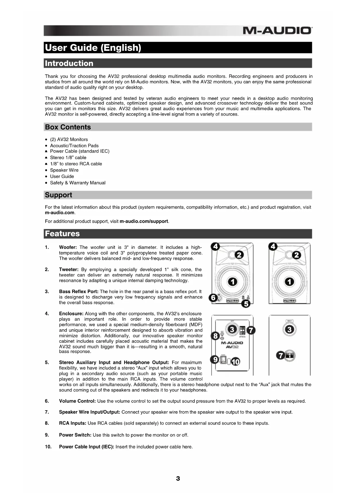- (2) AV32 Monitors • Acoustic/Traction Pads • Power Cable (standard IEC) • Stereo 1/8” cable • 1/8” to stereo RCA cable • Speaker Wire • User Guide • Safety & Warranty Manual Support For the latest information about this product (system requirements, compatibility information, etc.) and product registration, visit m-audio.com. For additional product support, visit m-audio.com/support. Features