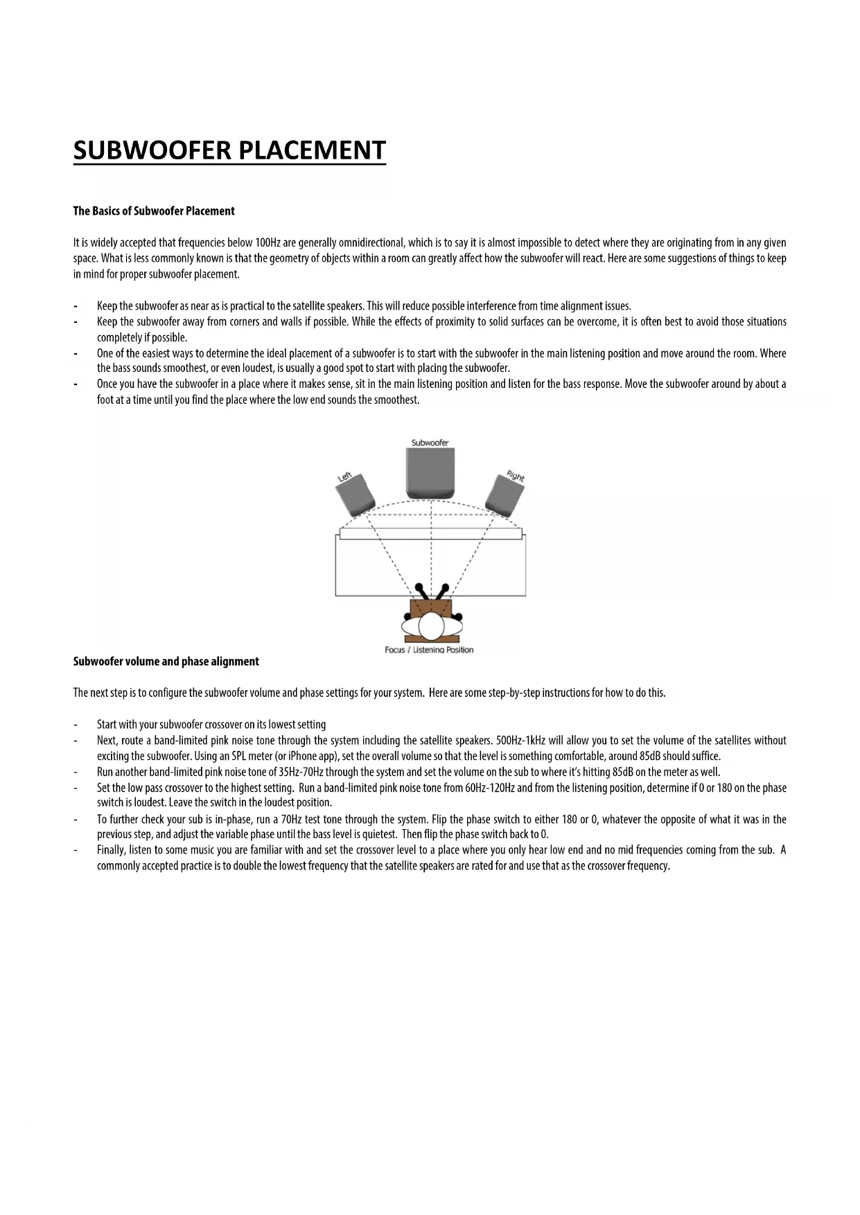 The Basics of Subwoofer Placement It is widely accepted that frequencies below 100Hz are generally omnidirectional, which is to say it is almost impossible to detect where they are originating from in any given space. What is less commonly known is that the geometry of objects within a room can greatly affect how the subwoofer will react. Here are some suggestions of things to keep in mind for proper subwoofer placement. ‐ Keep the subwoofer as near as is practical to the satellite speakers. This will reduce possible interference from time alignment issues. ‐ Keep the subwoofer away from corners and walls if possible. While the effects of proximity to solid surfaces can be overcome, it is often best to avoid those situations completely if possible. ‐ One of the easiest ways to determine the ideal placement of a subwoofer is to start with the subwoofer in the main listening position and move around the room. Where the bass sounds smoothest, or even loudest, is usually a good spot to start with placing the subwoofer. ‐ Once you have the subwoofer in a place where it makes sense, sit in the main listening position and listen for the bass response. Move the subwoofer around by about a foot at a time until you find the place where the low end sounds the smoothest.