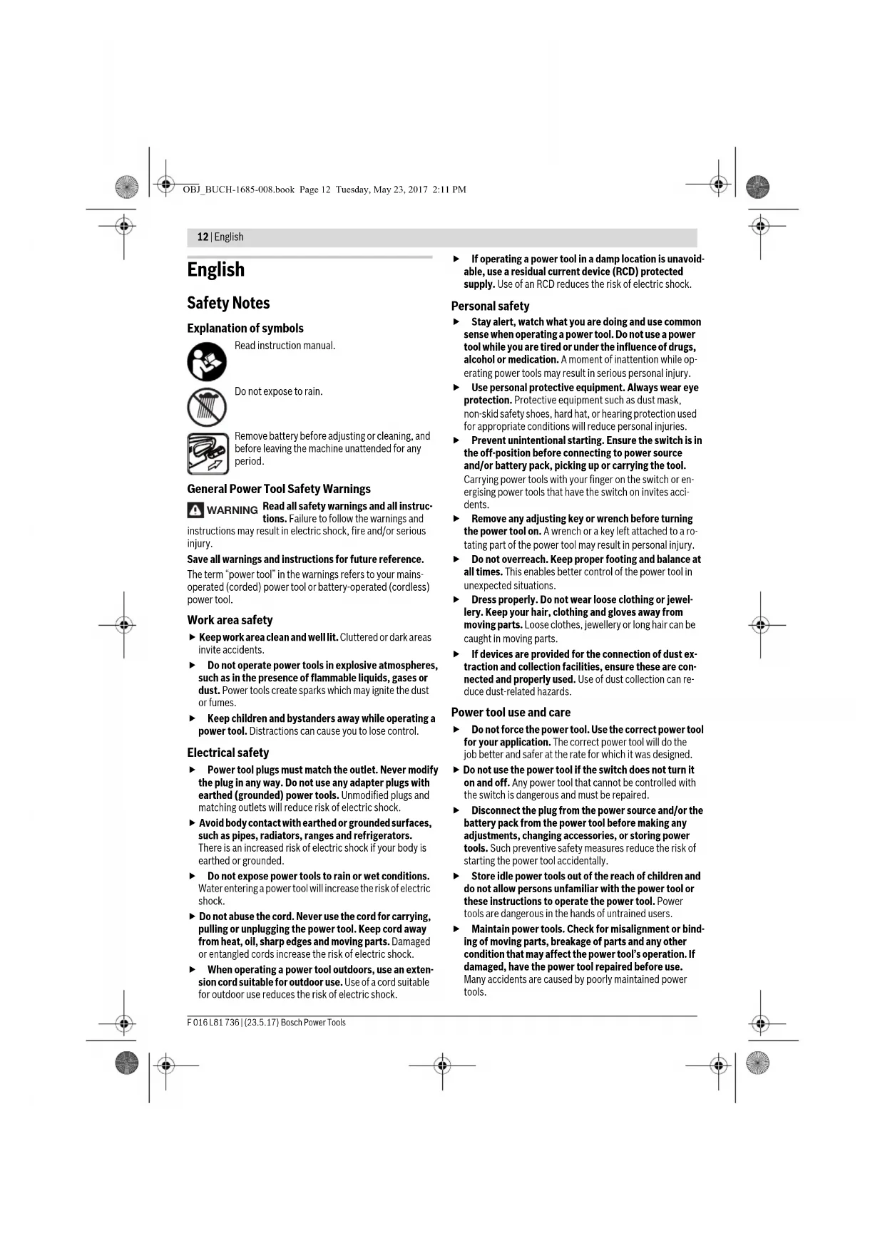The vibration level given in this information sheet has been measured in accordance with a standardised test given in EN 60745 and may be used to compare one tool with anoth- er. It may be used for a preliminary assessment of exposure. Battery Li-Ion Li-Ion Article number 1 607 A35 07N 1 607 A35 07N Rated voltage V1212 Capacity Ah 2.0 2.0 Number of battery cells