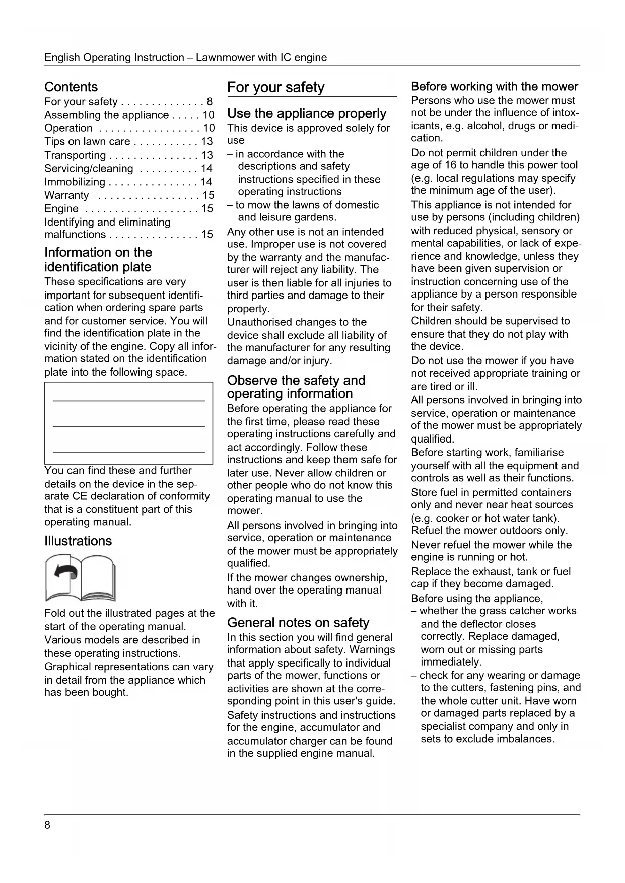 - Identifying and eliminating malfunctions Information on the identification plate These specifications are very important for subsequent identifi- cation when ordering spare parts and for customer service. You will find the identification plate in the vicinity of the engine. Copy all infor- mation stated on the identification plate into the following space. You can find these and further details on the device in the sep- arate CE declaration of conformity that is a constituent part of this operating manual. Illustrations Fold out the illustrated pages at the start of the operating manual. Various models are described in these operating instructions. Graphical representations can vary in detail from the appliance which has been bought. For your safety Use the appliance properly This device is approved solely for use – in accordance with the descriptions and safety instructions specified in these operating instructions – to mow the lawns of domestic and leisure gardens. Any other use is not an intended use. Improper use is not covered by the warranty and the manufac- turer will reject any liability. The user is then liable for all injuries to third parties and damage to their property. Unauthorised changes to the device shall exclude all liability of the manufacturer for any resulting damage and/or injury. Observe the safety and operating information Before operating the appliance for the first time, please read these operating instructions carefully and act accordingly. Follow these instructions and keep them safe for later use. Never allow children or other people who do not know this operating manual to use the mower. All persons involved in bringing into service, operation or maintenance of the mower must be appropriately qualified. If the mower changes ownership, hand over the operating manual with it. General notes on safety In this section you will find general information about safety. Warnings that apply specifically to individual parts of the mower, functions or activities are shown at the corre- sponding point in this user's guide. Safety instructions and instructions for the engine, accumulator and accumulator charger can be found in the supplied engine manual. Before working with the mower Persons who use the mower must not be under the influence of intox- icants, e.g. alcohol, drugs or medi- cation. Do not permit children under the age of 16 to handle this power tool (e.g. local regulations may specify the minimum age of the user). This appliance is not intended for use by persons (including children) with reduced physical, sensory or mental capabilities, or lack of expe- rience and knowledge, unless they have been given supervision or instruction concerning use of the appliance by a person responsible for their safety. Children should be supervised to ensure that they do not play with the device. Do not use the mower if you have not received appropriate training or are tired or ill. All persons involved in bringing into service, operation or maintenance of the mower must be appropriately qualified. Before starting work, familiarise yourself with all the equipment and controls as well as their functions. Store fuel in permitted containers only and never near heat sources (e.g. cooker or hot water tank). Refuel the mower outdoors only. Never refuel the mower while the engine is running or hot. Replace the exhaust, tank or fuel cap if they become damaged. Before using the appliance, – whether the grass catcher works and the deflector closes correctly. Replace damaged, worn out or missing parts immediately. – check for any wearing or damage to the cutters, fastening pins, and the whole cutter unit. Have worn or damaged parts replaced by a specialist company and only in sets to exclude imbalances.Operating Instruction – Lawnmower with IC engine English p. 15