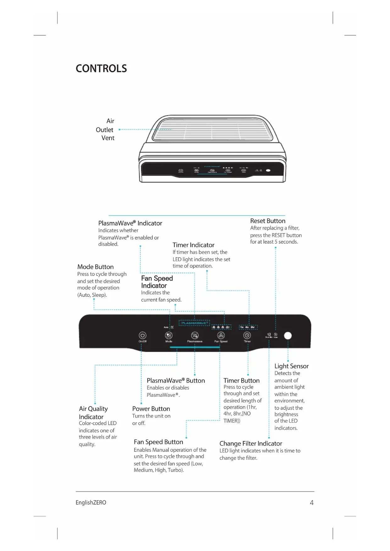 Unit Pre-lter/ (8) Carbon Filters/(2) True HEPA FilterUser Manual4 English ZERO CONTROLS 소피아 1 Air Outlet Vent 소피아 2 영문소피아 1 Reset Button After replacing a lter, press the RESET button for at least 5 seconds. Fan Speed Indicator Indicates the current fan speed. Timer Indicator If timer has been set, the LED light indicates the set time of operation. PlasmaWave Indicator Indicates whether PlasmaWave is enabled or disabled. Air Quality Indicator Color-coded LED indicates one of three levels of air quality. Mode Button Press to cycle through and set the desired mode of operation (Auto, Sleep). Power Button Turns the unit on or o. Fan Speed Button Enables Manual operation of the unit. Press to cycle through and set the desired fan speed (Low, Medium, High, Turbo). PlasmaWave Button Enables or disables PlasmaWave . Light Sensor Detects the amount of ambient light within the environment, to adjust the brightness of the LED indicators. Timer Button Press to cycle through and set desired length of operation (1hr, 4hr, 8hr,[NO TIMER]) Change Filter Indicator LED light indicates when it is time to change the lter.5 English ZERO