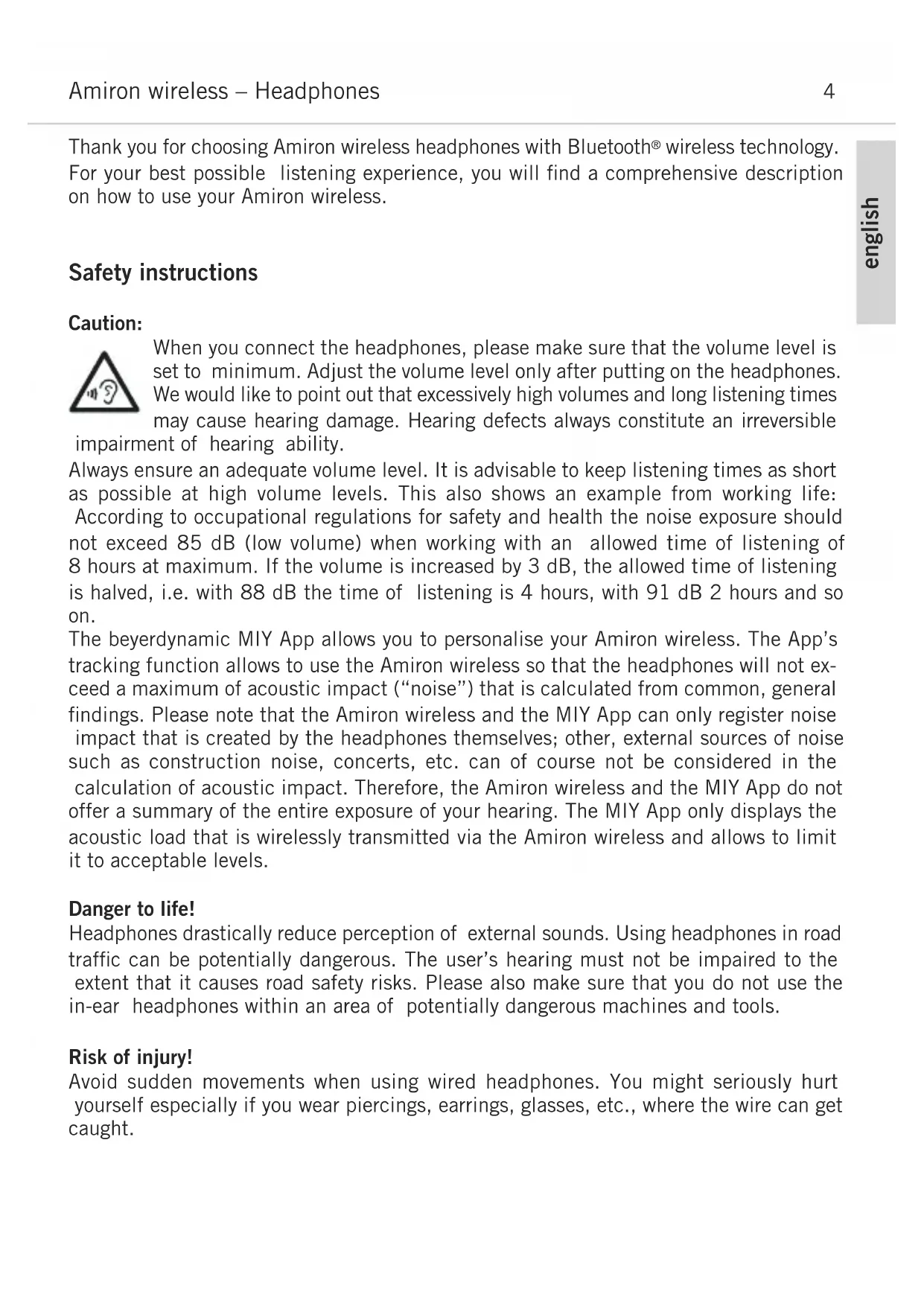 Safety instructions Caution: When you connect the headphones, please make sure that the volume level is set to minimum. Adjust the volume level only after putting on the headphones. We would like to point out that excessively high volumes and long listening times may cause hearing damage. Hearing defects always constitute an irreversible impairment of hearing ability. Always ensure an adequate volume level. It is advisable to keep listening times as short as possible at high volume levels. This also shows an example from working life: According to occupational regulations for safety and health the noise exposure should not exceed 85 dB (low volume) when working with an allowed time of listening of 8 hours at maximum. If the volume is increased by 3 dB, the allowed time of listening is halved, i.e. with 88 dB the time of listening is 4 hours, with 91 dB 2 hours and so on. The beyerdynamic MIY App allows you to personalise your Amiron wireless. The App’s tracking function allows to use the Amiron wireless so that the headphones will not ex- ceed a maximum of acoustic impact (“noise”) that is calculated from common, general findings. Please note that the Amiron wireless and the MIY App can only register noise impact that is created by the headphones themselves; other, external sources of noise such as construction noise, concerts, etc. can of course not be considered in the calculation of acoustic impact. Therefore, the Amiron wireless and the MIY App do not offer a summary of the entire exposure of your hearing. The MIY App only displays the acoustic load that is wirelessly transmitted via the Amiron wireless and allows to limit it to acceptable levels. Danger to life! Headphones drastically reduce perception of external sounds. Using headphones in road traffic can be potentially dangerous. The user’s hearing must not be impaired to the extent that it causes road safety risks. Please also make sure that you do not use the in-ear headphones within an area of potentially dangerous machines and tools. Risk of injury! Avoid sudden movements when using wired headphones. You might seriously hurt yourself especially if you wear piercings, earrings, glasses, etc., where the wire can get caught.english Amiron wireless – Headphones
