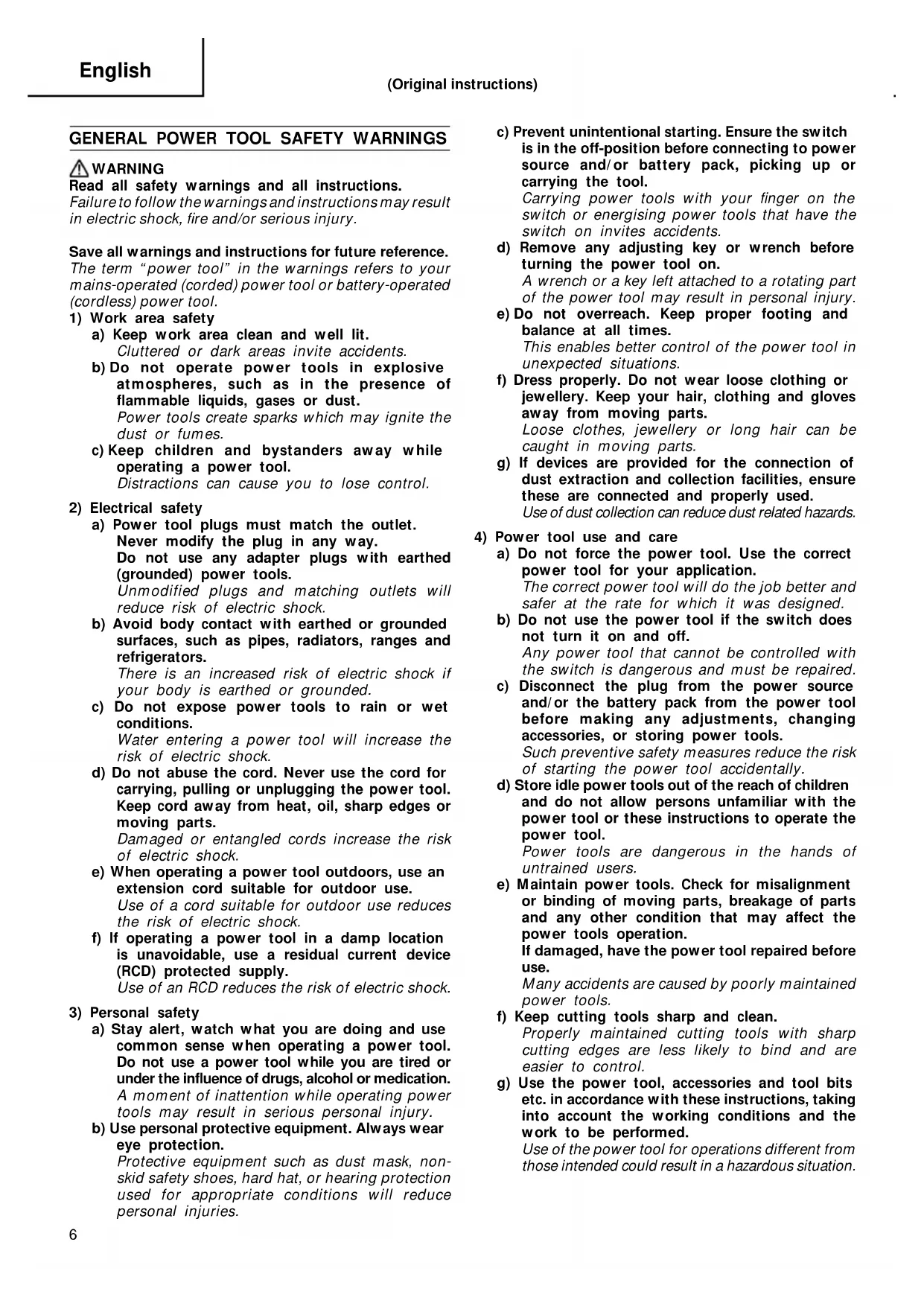 a) Do not force the power tool. Use the correct power tool for your application. The correct power tool will do the job better and safer at the rate for which it was designed. b) Do not use the power tool if the switch does not turn it on and off. Any power tool that cannot be controlled with the switch is dangerous and must be repaired. c) Disconnect the plug from the power source and/or the battery pack from the power tool before making any adjustments, changing accessories, or storing power tools. Such preventive safety measures reduce the risk of starting the power tool accidentally. d) Store idle power tools out of the reach of children and do not allow persons unfamiliar with the power tool or these instructions to operate the power tool. Power tools are dangerous in the hands of untrained users. e) Maintain power tools. Check for misalignment or binding of moving parts, breakage of parts and any other condition that may affect the power tools operation. If damaged, have the power tool repaired before use. Many accidents are caused by poorly maintained power tools. f) Keep cutting tools sharp and clean. Properly maintained cutting tools with sharp cutting edges are less likely to bind and are easier to control. g) Use the power tool, accessories and tool bits etc. in accordance with these instructions, taking into account the working conditions and the work to be performed. Use of the power tool for operations different from those intended could result in a hazardous situation. (Original instructions) 01Eng_DS14DJL_WE.p65 2/21/14, 10:2667 English