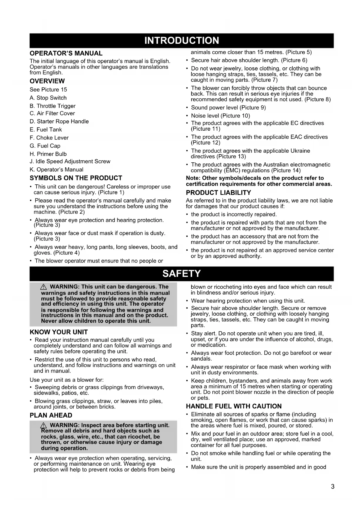 - The blower can forcibly throw objects that can bounce back. This can result in serious eye injuries if the recommended safety equipment is not used. (Picture 8)