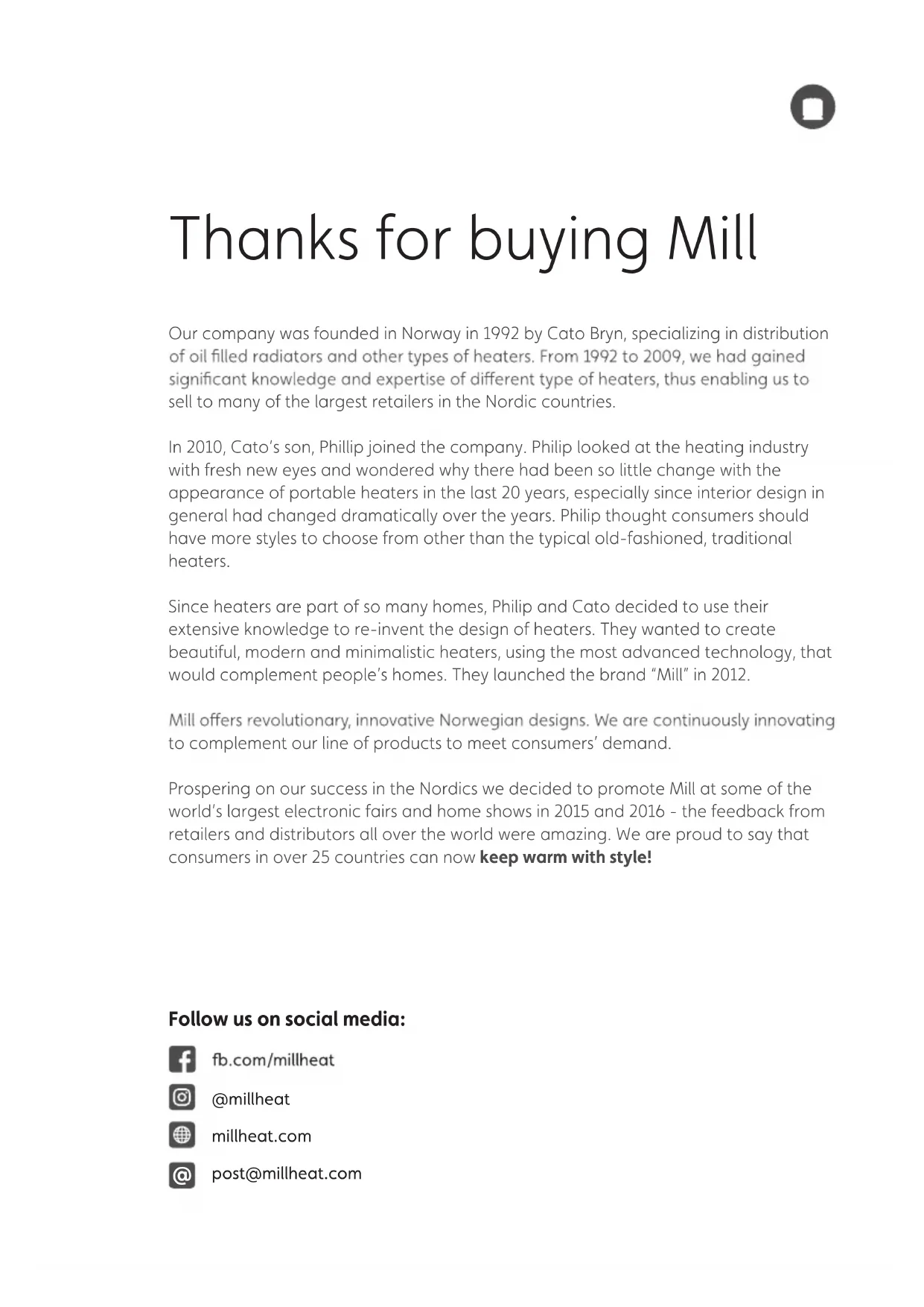 Šis produkts ir piemērots tikai labi izolētām telpām vai nepatstāvigailietošanai. Šis gaminys tinkamas naudoti tik gerai izoliuotose vietose arnorint naudoti retkarčiais.Thanks for buying Mill Our company was founded in Norway in 1992 by Cato Bryn, specializing in distribution sell to many of the largest retailers in the Nordic countries. In 2010, Cato’s son, Phillip joined the company. Philip looked at the heating industry with fresh new eyes and wondered why there had been so little change with the appearance of portable heaters in the last 20 years, especially since interior design in general had changed dramatically over the years. Philip thought consumers should have more styles to choose from other than the typical old-fashioned, traditional heaters. Since heaters are part of so many homes, Philip and Cato decided to use their extensive knowledge to re-invent the design of heaters. They wanted to create beautiful, modern and minimalistic heaters, using the most advanced technology, that would complement people’s homes. They launched the brand “Mill” in 2012. to complement our line of products to meet consumers’ demand. Prospering on our success in the Nordics we decided to promote Mill at some of the world’s largest electronic fairs and home shows in 2015 and 2016 - the feedback from retailers and distributors all over the world were amazing. We are proud to say that consumers in over 25 countries can now keep warm with style! Follow us on social media: @millheat millheat.com post@millheat.com @P. 7 P. 7 P. 7 MaintenanceWarrantyWaste disposal