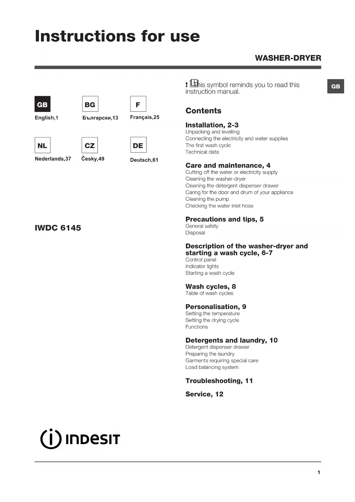 Contents Installation, 2-3 Unpacking and levelling Connecting the electricity and water supplies The first wash cycle Technical data Care and maintenance, 4 Cutting off the water or electricity supply Cleaning the washer-dryer Cleaning the detergent dispenser drawer Caring for the door and drum of your appliance Cleaning the pump Checking the water inlet hose Precautions and tips, 5 General safety Disposal Description of the washer-dryer and starting a wash cycle, 6-7 Control panel Indicator lights Starting a wash cycle Wash cycles, 8 Table of wash cycles Personalisation, 9 Setting the temperature Setting the drying cycle Functions Detergents and laundry, 10 Detergent dispenser drawer Preparing the laundry Garments requiring special care Load balancing system Troubleshooting, 11 Service, 12 IWDC 6145 Instructions for use WASHER-DRYER English,1