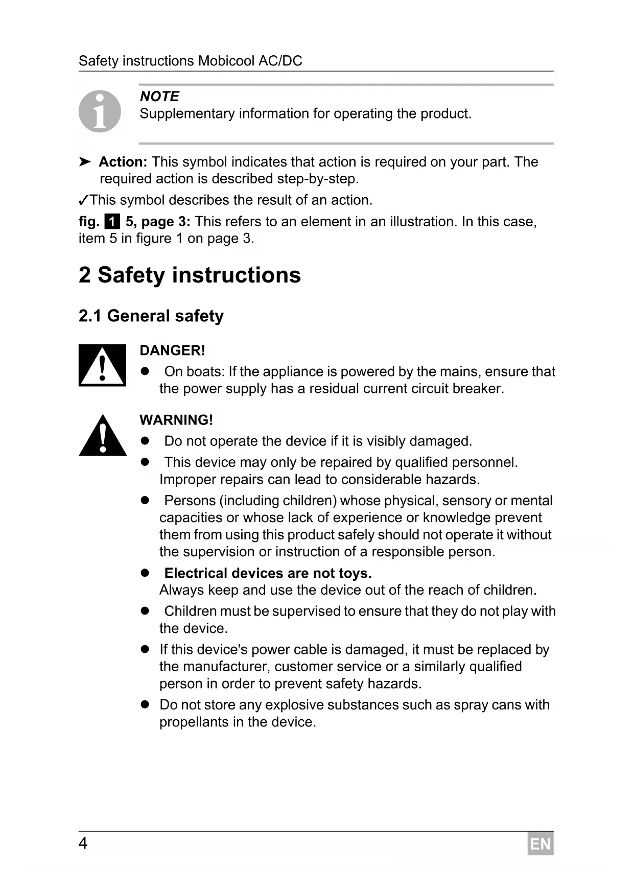 NOTICE! Failure to observe this instruction can cause material damage and impair the function of the product.EN Safety instructions Mobicool AC/DC