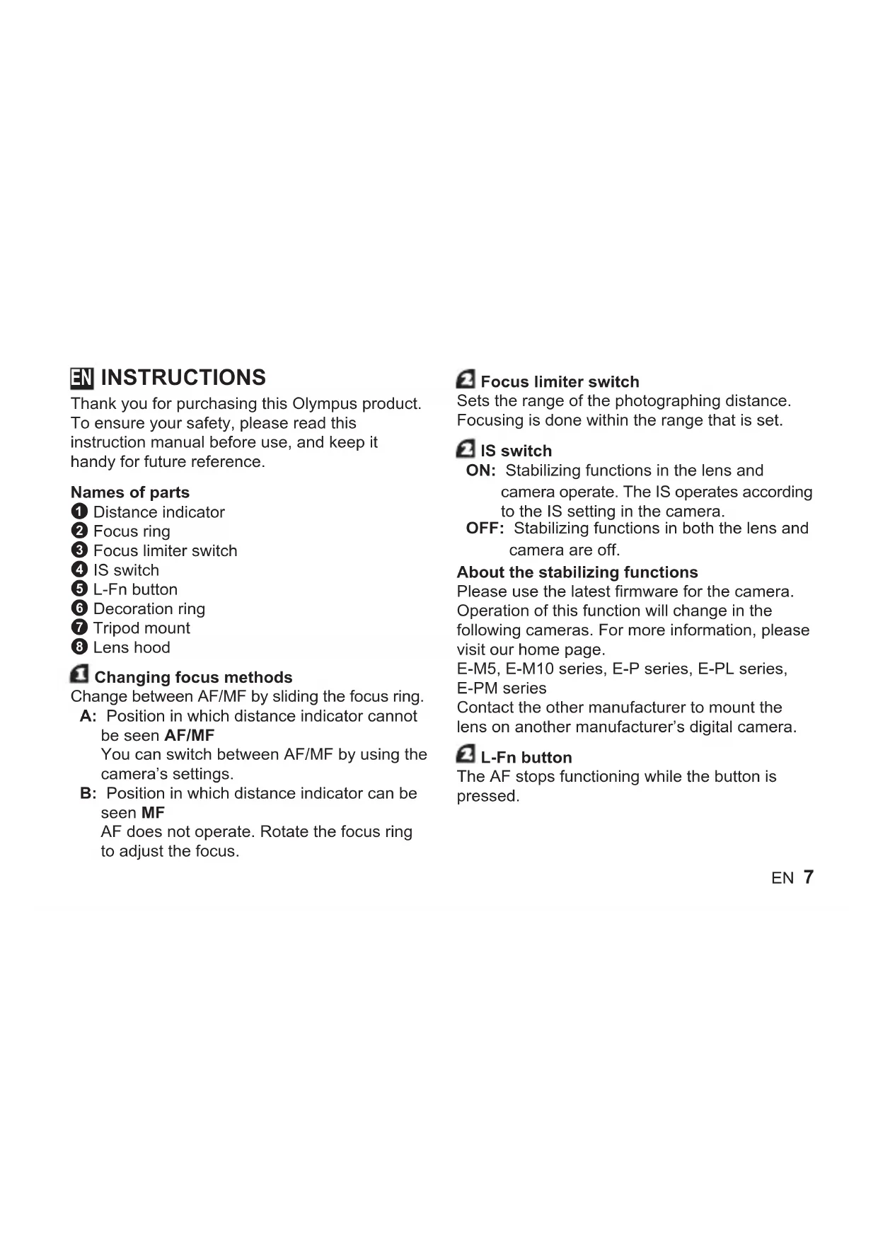 ピックアップサービス(引取修理)のご案内 弊社指定の運送業者が、梱包資材を持って お客様ご指定の日時にご自宅へ伺います。 オリンパス修理ピックアップ窓口 0120-971995 フリーダ イヤ ルEN 7 INSTRUCTIONS Thank you for purchasing this Olympus product. To ensure your safety, please read this instruction manual before use, and keep it handy for future reference. Names of parts 1 Distance indicator 2 Focus ring 3 Focus limiter switch 4 IS switch 5 L-Fn button 6 Decoration ring 7 Tripod mount 8 Lens hood Changing focus methods Change between AF/MF by sliding the focus ring. A: Position in which distance indicator cannot be seen AF/MF You can switch between AF/MF by using the camera’s settings. B: Position in which distance indicator can be seen MF AF does not operate. Rotate the focus ring to adjust the focus. Focus limiter switch Sets the range of the photographing distance. Focusing is done within the range that is set. IS switch ON: Stabilizing functions in the lens and camera operate. The IS operates according to the IS setting in the camera. OFF: Stabilizing functions in both the lens and camera are off. About the stabilizing functions Please use the latest firmware for the camera. Operation of this function will change in the following cameras. For more information, please visit our home page. E-M5, E-M10 series, E-P series, E-PL series, E-PM series Contact the other manufacturer to mount the lens on another manufacturer’s digital camera. L-Fn button The AF stops functioning while the button is pressed. EN8 EN Removing the tripod mount and attaching the decoration ring Removing the tripod mount: Turn the knob of the tripod mount to the left to loosen it 1. Turn the tripod mount to the left, align it with the mark 2, and remove it from the lens body 3. Attaching the decoration ring: Align the marks and insert the decoration ring 1, then turn it to the right until it stops (until you hear it snap) 2. How to use the lens hood Pull it outward until it stops 1, and then turn it to the right 2. The lens hood cannot be removed from the lens. Notes on Shooting