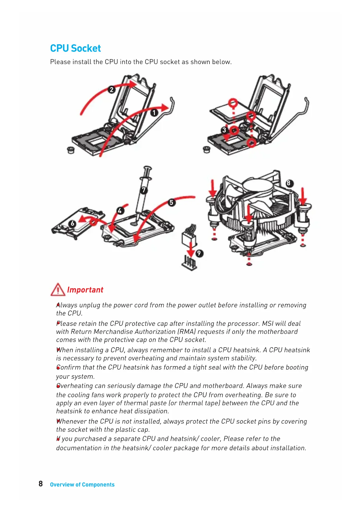 Please retain the CPU protective cap after installing the processor. MSI will deal with Return Merchandise Authorization (RMA) requests if only the motherboard comes with the protective cap on the CPU socket.
