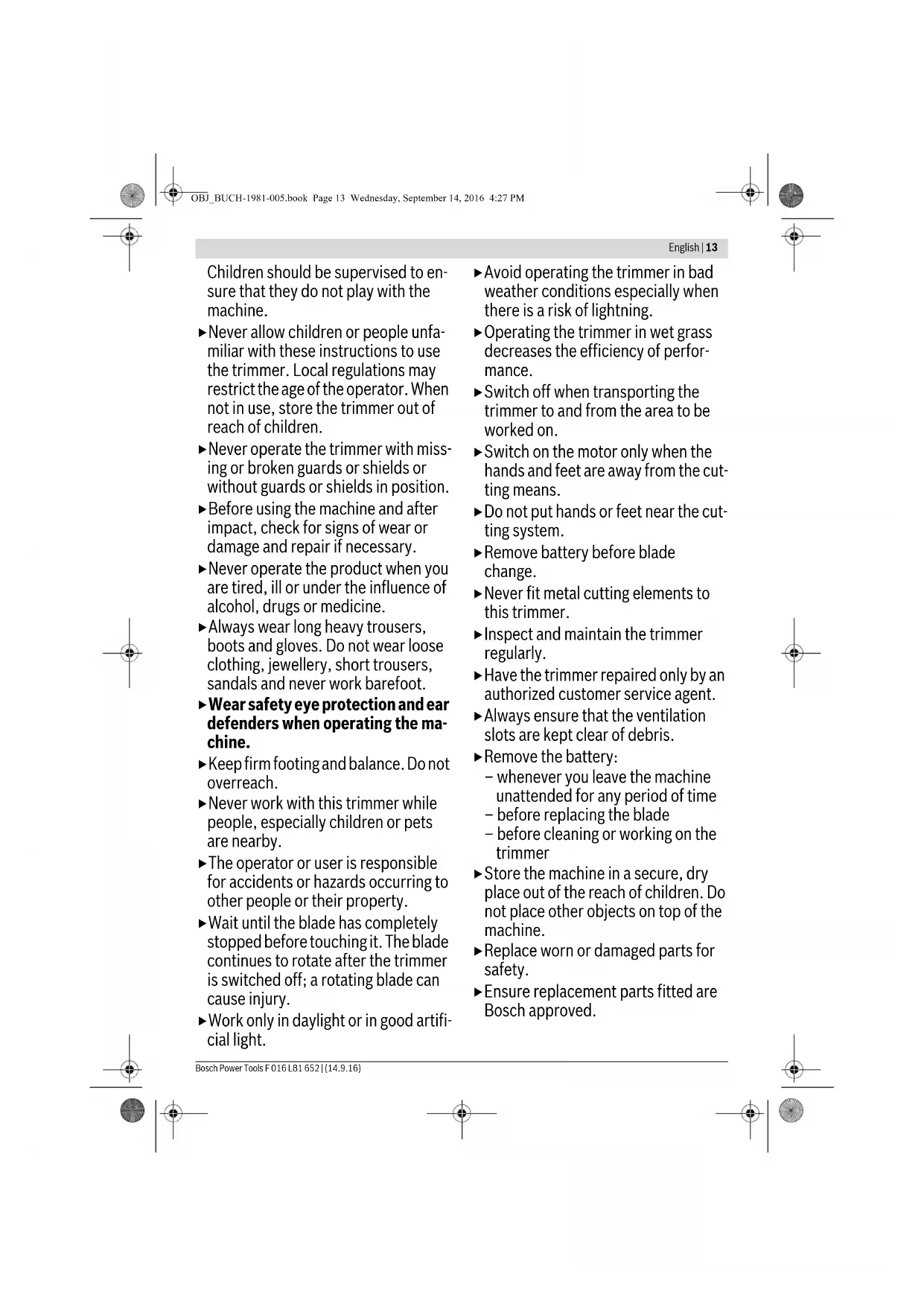 machine when operating. Operation This machine is not intended for use by persons (including children) with reduced physical, sensory or mental capabilities, or lack of experience and knowledge, unless they have been given supervision or instruction con- cerning use of the machine by a per- son responsible for their safety. a.c. d.c. OBJ_BUCH-1981-005.book Page 12 Wednesday, September 14, 2016 4:27 PMEnglish | 13 Bosch Power Tools F 016 L81 652 | (14.9.16) Children should be supervised to en- sure that they do not play with the machine. Never allow children or people unfa- miliar with these instructions to use the trimmer. Local regulations may restrict the age of the operator. When not in use, store the trimmer out of reach of children. Never operate the trimmer with miss- ing or broken guards or shields or without guards or shields in position. Before using the machine and after impact, check for signs of wear or damage and repair if necessary. Never operate the product when you are tired, ill or under the influence of alcohol, drugs or medicine. Always wear long heavy trousers, boots and gloves. Do not wear loose clothing, jewellery, short trousers, sandals and never work barefoot. Wear safety eye protection and ear defenders when operating the ma- chine. Keep firm footing and balance. Do not overreach. Never work with this trimmer while people, especially children or pets are nearby. The operator or user is responsible for accidents or hazards occurring to other people or their property. Wait until the blade has completely stopped before touching it. The blade continues to rotate after the trimmer is switched off; a rotating blade can cause injury. Work only in daylight or in good artifi- cial light. Avoid operating the trimmer in bad weather conditions especially when there is a risk of lightning. Operating the trimmer in wet grass decreases the efficiency of perfor- mance. Switch off when transporting the trimmer to and from the area to be worked on. Switch on the motor only when the hands and feet are away from the cut- ting means. Do not put hands or feet near the cut- ting system. Remove battery before blade change. Never fit metal cutting elements to this trimmer. Inspect and maintain the trimmer regularly. Have the trimmer repaired only by an authorized customer service agent. Always ensure that the ventilation slots are kept clear of debris. Remove the battery: – whenever you leave the machine unattended for any period of time – before replacing the blade – before cleaning or working on the trimmer Store the machine in a secure, dry place out of the reach of children. Do not place other objects on top of the machine. Replace worn or damaged parts for safety. Ensure replacement parts fitted are Bosch approved. OBJ_BUCH-1981-005.book Page 13 Wednesday, September 14, 2016 4:27 PM14 | English F 016 L81 652 | (14.9.16) Bosch Power Tools Do not operate the machine with- out the trimmer attachment fitted. Recommendations for Optimal Handling of the Battery Ensure the switch is in the off posi- tion before inserting battery pack. Inserting the battery pack into ma- chines that have the switch on can cause accidents. Use only Bosch battery packs in- tended specifically for the ma- chine. Use of any other battery packs may create a risk of injury and fire. Do not open the battery. Danger of short-circuiting. Protect the battery against heat, e. g., against continuous intense sunlight, fire, water, and moisture. Danger of explo- sion. When battery pack is not in use, keep it away from other metal ob- jects like paper clips, coins, keys, nails, screws, or other small metal objects that can make a connection from one terminal to another. Shorting the battery terminals to- gether may cause burns or a fire. In case of damage and improper use of the battery, vapours may be emitted. Ventilate the area and seek medical help in case of com- plaints. The vapours can irritate the respiratory system. Use the battery only in conjunction with your Bosch product. This measure alone protects the battery against dangerous overload. The battery can be damaged by pointed objects such as nails or screwdrivers or by force applied externally. An internal short circuit can occur and the battery can burn, smoke, explode or overheat. Do not short-circuit the battery. There is danger of explosion. Protect the battery against moisture and water. Store the battery only within a tem- perature range between –20 °C and 50 °C. As an example, do not leave the battery in the car in summer. Occasionally clean the venting slots of the battery using a soft, clean and dry brush. Safety Warnings for Battery Chargers Read all safety warnings and all instructions. Failure to follow the warnings and in- structions may result in elec- tric shock, fire and/or serious injury. Save these instructions. Use the battery charger only when you fully understand and can perform all functions without limitation, or have re- ceived appropriate instructions. This charger is not intended for use by children and persons with phy- sical, sensory or mental limitations or a lack of experience or know- ledge. This charger can be used by children aged 8 and above and by persons who have physical, senso- ry or mental limitations or a lack of experience or knowledge if a per- son responsible for their safety su- OBJ_BUCH-1981-005.book Page 14 Wednesday, September 14, 2016 4:27 PMEnglish | 15 Bosch Power Tools F 016 L81 652 | (14.9.16) pervises them or has instructed them in the safe operation of the charger and they understand the associated dangers. Otherwise, there is a danger of operating errors and injuries. Supervise children during use, cleaning and maintenance. This will ensure that children do not play with the charger. Only charge Bosch lithium-ion batteries with a capacity of 1.5 Ah or more (5 battery cells or more). The battery voltage must match the battery charging voltage of the charger. Do not charge non-re- chargeable batte