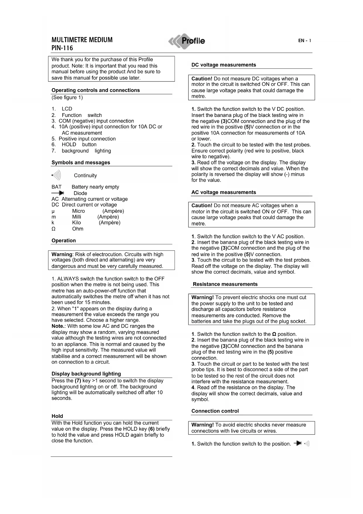 Download the instructions for your Multimeter in PDF format for free! Find your manual PIN116 - Profile and take your electronic device back in hand. On this page are published all the documents necessary for the use of your device. PIN116 by Profile.
