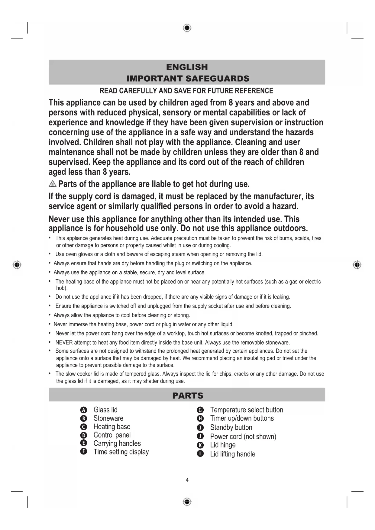 - Since 1970 -Lift and Serve - 4.7L Digital Slow CookerEnglish 4 Français/French 11 Deutsch/German 18 Español/Spanish 25 Português/Portuguese 32 Italiano/Italian 39 Nederlands/Dutch 46 Svenska/Swedish 53 Suomi/Finnish 59 Dansk/Danish 65 Norsk/Norwegian 72 Polski/Polish 79 Česky/Czech 86 Slovenčina/Slovakian 92 Magyar/Hungarian 99 Română/Romanian 106 български/Bulgarian 113 Hrvatski/Croatian 120 ΕΛΛΗΝΙΚΑ/Greek 126 FITTING A PLUG (UK AND IRELAND ONLY) This appliance must be earthed. If the plug is not suitable for the socket outlets in your home, it can be removed and replaced by a plug of the correct type. If the fuse in a moulded plug needs to be changed, the fuse cover must be refitted. The appliance must not be used without the fuse cover fitted. If the plug is unsuitable, it should be dismantled and removed from the supply cord and an appropriate plug fitted as detailed. If you remove the plug it must not be connected to a 13 amp socket and the plug must be disposed of immediately. If the terminals in the plug are not marked or if you are unsure about the installation of the plug please contact a qualified electrician. Blue (Neutral) Brown (Live) Fuse Green/Yellow (Earth) Plug should be ASTA approved to BS1363 Fuse should be ASTA approved to BS1362 Ensure that the outer sheath of the cable is firmly held by the cord grip 3A4 ENGLISH IMPORTANT SAFEGUARDS READ CAREFULLY AND SAVE FOR FUTURE REFERENCE This appliance can be used by children aged from 8 years and above and persons with reduced physical, sensory or mental capabilities or lack of experience and knowledge if they have been given supervision or instruction concerning use of the appliance in a safe way and understand the hazards involved. Children shall not play with the appliance. Cleaning and user maintenance shall not be made by children unless they are older than 8 and supervised. Keep the appliance and its cord out of the reach of children aged less than 8 years. Parts of the appliance are liable to get hot during use. If the supply cord is damaged, it must be replaced by the manufacturer, its service agent or similarly qualified persons in order to avoid a hazard. Never use this appliance for anything other than its intended use. This appliance is for household use only. Do not use this appliance outdoors.