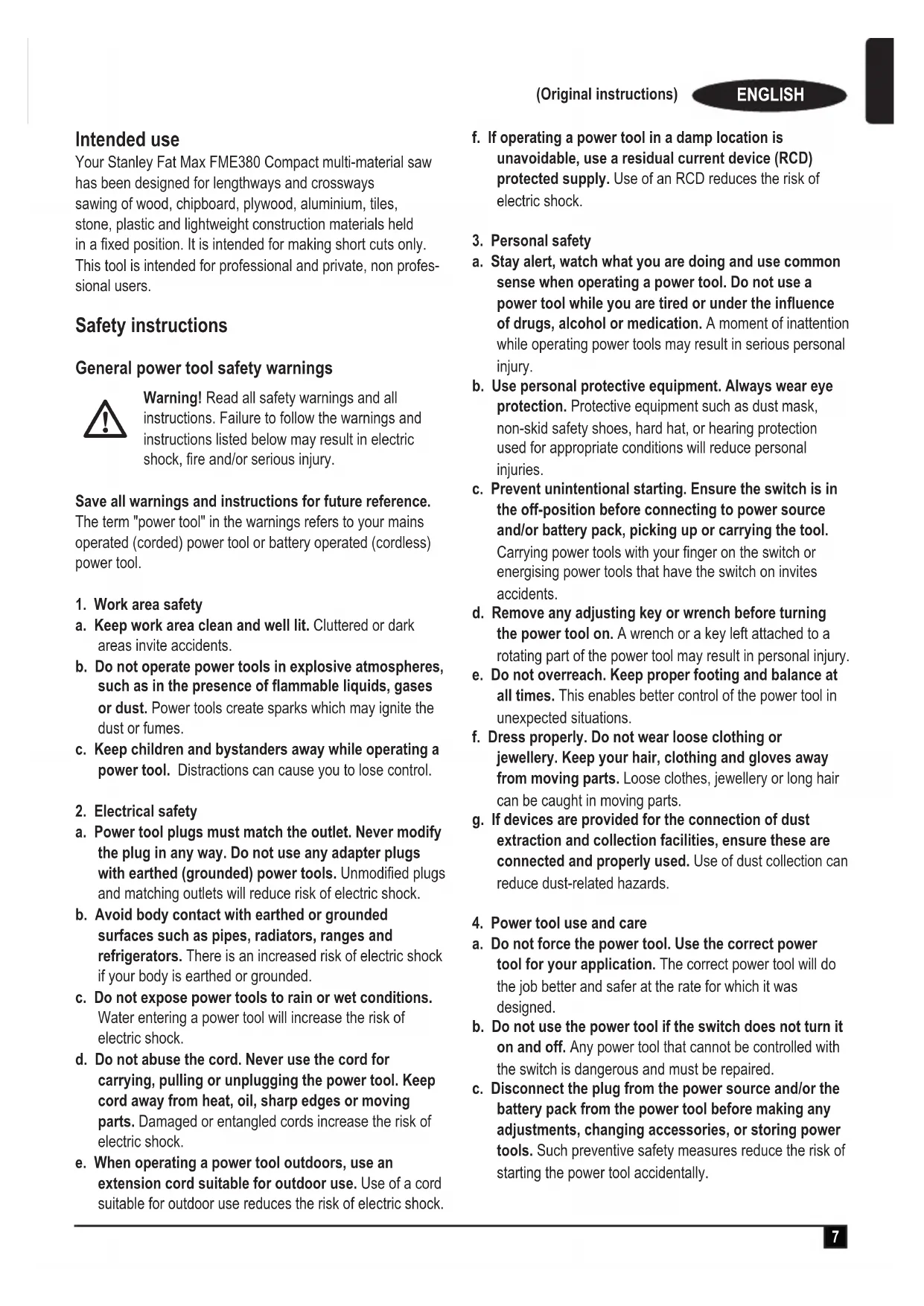 Your Stanley Fat Max FME380 Compact multi-material saw has been designed for lengthways and crossways sawing of wood, chipboard, plywood, aluminium, tiles, stone, plastic and lightweight construction materials held in a fixed position. It is intended for making short cuts only. This tool is intended for professional and private, non professional users.