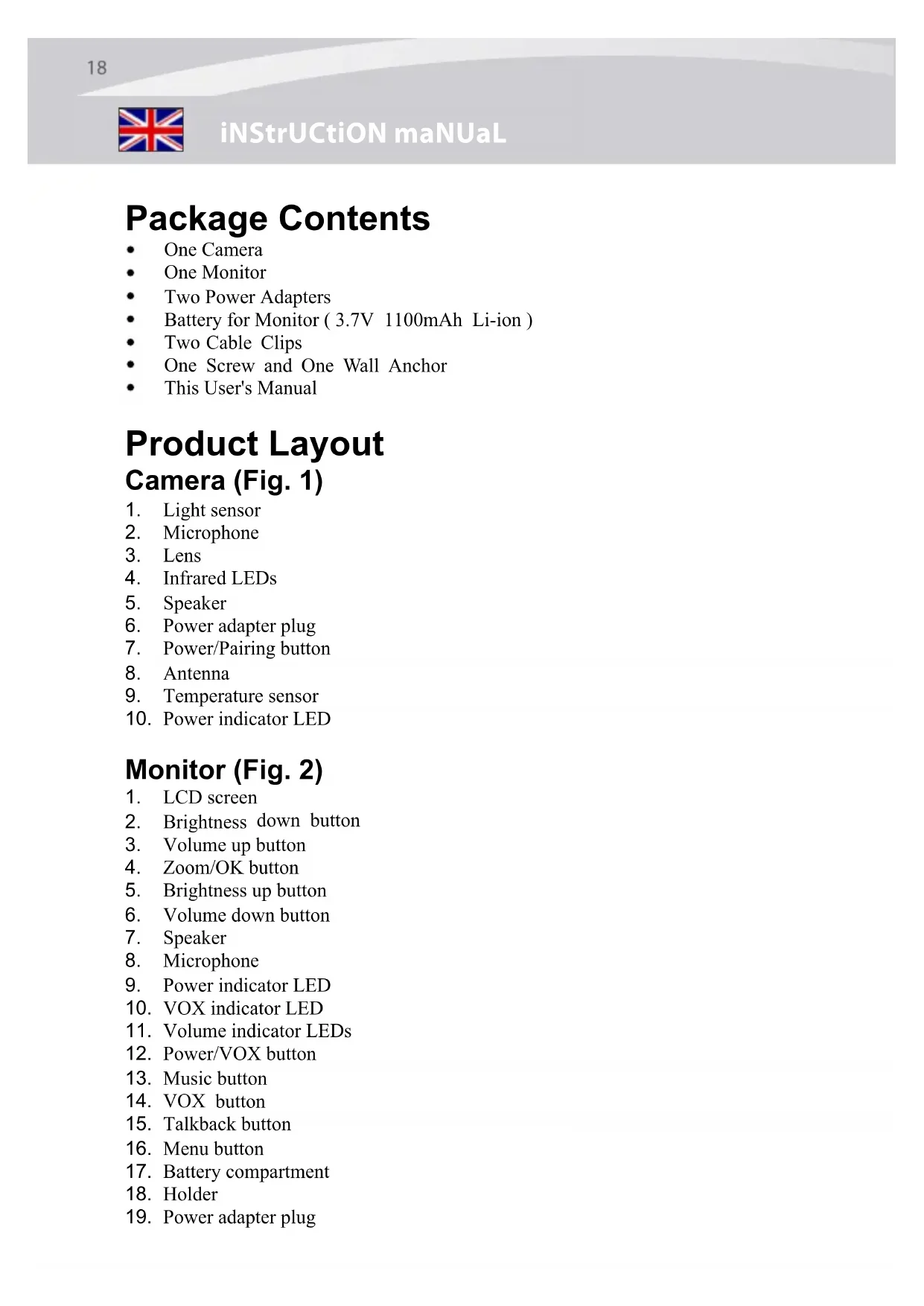 Package Contents Two Power Adapters Battery for Monitor ( 3.7V 1100mAh Li-ion ) Two Cable Clips One Screw and One Wall Anchor This User's Manual Product Layout Camera (Fig. 1) 1. Light sensor 2. Microphone3. Lens4. Infrared LEDs5. Speaker6. Power adapter plug7. Power/Pairing button8. Antenna9. Temperature sensor10. Power indicator LED Monitor (Fig. 2)