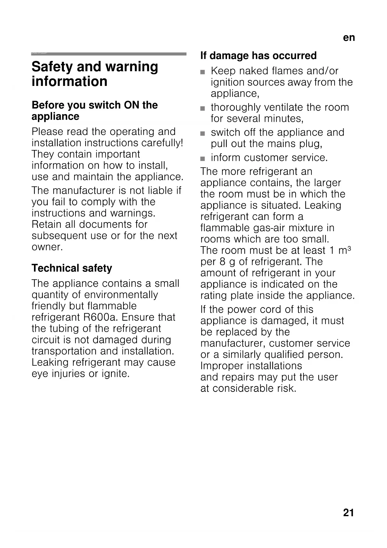 enTable of Contents enInstruction for Use Safety and warning information Before you switch ON the appliance Please read the operating and installation instructions carefully! They contain important information on how to install, use and maintain the appliance. The manufacturer is not liable if you fail to comply with the instructions and warnings. Retain all documents for subsequent use or for the next owner. Technical safety The appliance contains a small quantity of environmentally friendly but flammable refrigerant R600a. Ensure that the tubing of the refrigerant circuit is not damaged during transportation and installation. Leaking refrigerant may cause eye injuries or ignite. If damage has occurred ■ Keep naked flames and/or ignition sources away from the appliance, ■ thoroughly ventilate the room for several minutes, ■ switch off the appliance and pull out the mains plug, ■ inform customer service. The more refrigerant an appliance contains, the larger the room must be in which the appliance is situated. Leaking refrigerant can form a flammable gas-air mixture in rooms which are too small. The room must be at least 1 m³ per 8 g of refrigerant. The amount of refrigerant in your appliance is indicated on the rating plate inside the appliance. If the power cord of this appliance is damaged, it must be replaced by the manufacturer, customer service or a similarly qualified person. Improper installations and repairs may put the user at considerable risk.en