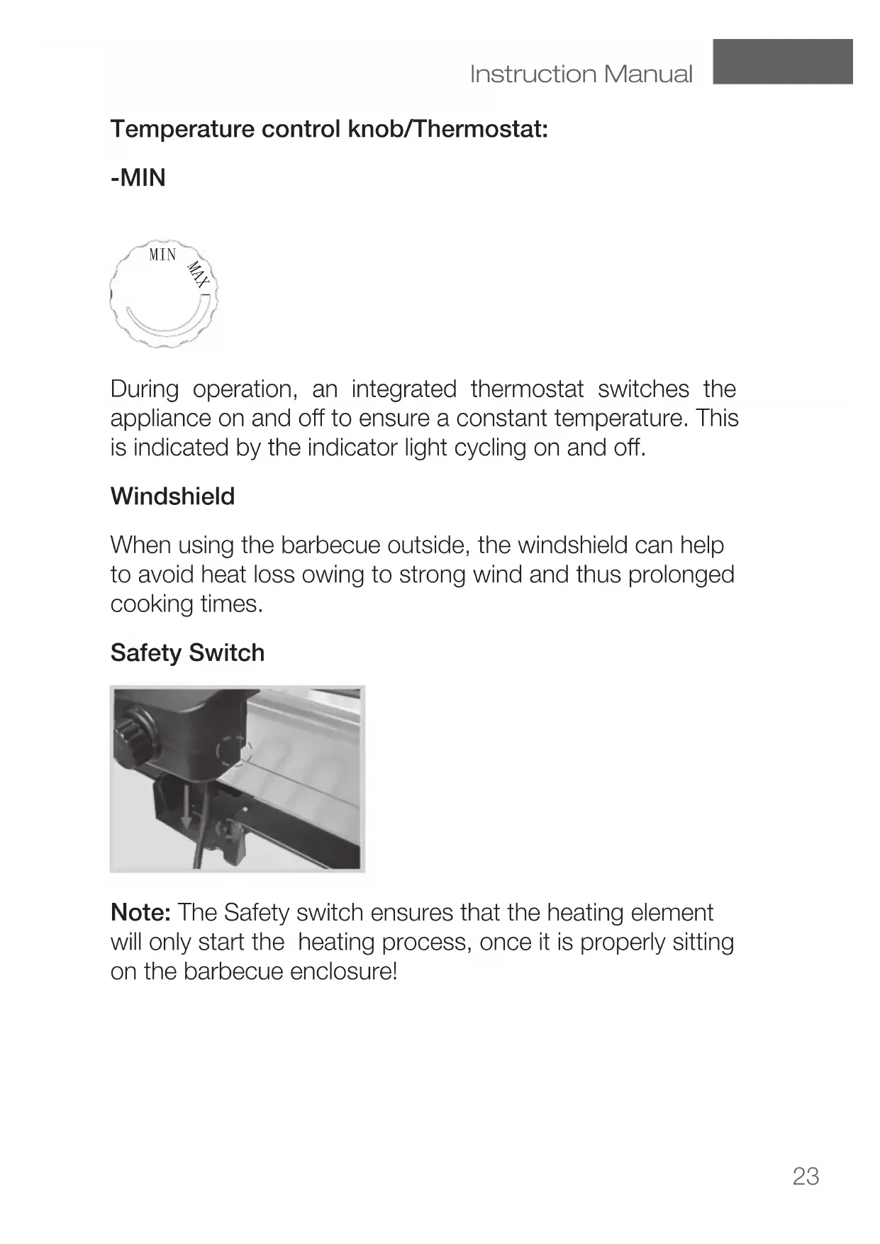 Temperature control knob/Thermostat: -MIN -MAX MAX MIN During operation, an integrated thermostat switches the appliance on and off to ensure a constant temperature. This is indicated by the indicator light cycling on and off. Windshield When using the barbecue outside, the windshield can help to avoid heat loss owing to strong wind and thus prolonged cooking times. Safety Switch Note: The Safety switch ensures that the heating element will only start the heating process, once it is properly sitting on the barbecue enclosure!24 Before First Use
