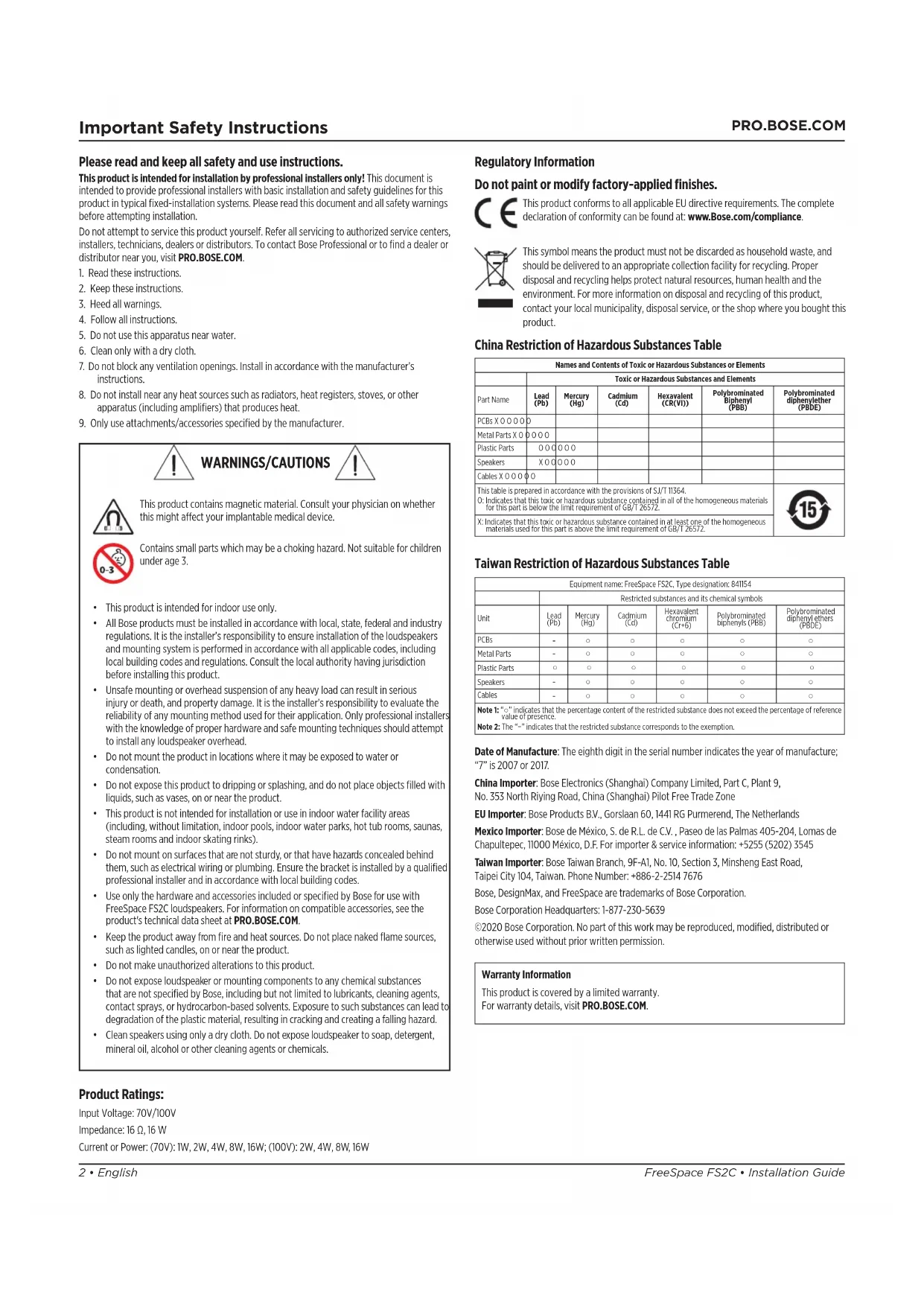 Regulatory Information Do not paint or modify factory-applied finishes. This product conforms to all applicable EU directive requirements. The complete declaration of conformity can be found at: www.Bose.com/compliance. This symbol means the product must not be discarded as household waste, and should be delivered to an appropriate collection facility for recycling. Proper disposal and recycling helps protect natural resources, human health and the environment. For more information on disposal and recycling of this product, contact your local municipality, disposal service, or the shop where you bought this product. China Restriction of Hazardous Substances Table Names and Contents of Toxic or Hazardous Substances or Elements Toxic or Hazardous Substances and Elements Part Name Lead (Pb) Mercury (Hg) Cadmium (Cd) Hexavalent (CR(VI)) Polybrominated Biphenyl (PBB) Polybrominated diphenylether (PBDE) PCBs X O O O O O Metal Parts X O O O O O Plastic Parts O O O O O O Speakers X O O O O O Cables X O O O O O This table is prepared in accordance with the provisions of SJ/T 11364. O: Indicates that this toxic or hazardous substance contained in all of the homogeneous materials for this part is below the limit requirement of GB/T 26572. X: Indicates that this toxic or hazardous substance contained in at least one of the homogeneous materials used for this part is above the limit requirement of GB/T 26572. Taiwan Restriction of Hazardous Substances Table Equipment name: FreeSpace FS2C, Type designation: 841154 Restricted substances and its chemical symbols Unit Lead (Pb) Mercury (Hg) Cadmium (Cd) Hexavalent chromium (Cr+6) Polybrominated biphenyls (PBB) Polybrominated diphenyl ethers (PBDE) PCBs - ○ ○ ○ ○ ○ Metal Parts - ○ ○ ○ ○ ○ Plastic Parts ○ ○ ○ ○ ○ ○ Speakers - ○ ○ ○ ○ ○ Cables - ○ ○ ○ ○ ○ Note 1: “○” indicates that the percentage content of the restricted substance does not exceed the percentage of reference value of presence. Note 2: The “−” indicates that the restricted substance corresponds to the exemption. Date of Manufacture: The eighth digit in the serial number indicates the year of manufacture; “7” is 2007 or 2017. China Importer: Bose Electronics (Shanghai) Company Limited, Part C, Plant 9, No. 353 North Riying Road, China (Shanghai) Pilot Free Trade Zone EU Importer: Bose Products B.V., Gorslaan 60, 1441 RG Purmerend, The Netherlands Mexico Importer: Bose de México, S. de R.L. de C.V. , Paseo de las Palmas 405-204, Lomas de Chapultepec, 11000 México, D.F. For importer & service information: +5255 (5202) 3545 Taiwan Importer: Bose Taiwan Branch, 9F-A1, No. 10, Section 3, Minsheng East Road, Taipei City 104, Taiwan. Phone Number: +886-2-2514 7676 Bose, DesignMax, and FreeSpace are trademarks of Bose Corporation. Bose Corporation Headquarters: 1-877-230-5639 ©2020 Bose Corporation. No part of this work may be reproduced, modified, distributed or otherwise used without prior written permission. Warranty Information This product is covered by a limited warranty. For warranty details, visit PRO.BOSE.COM. Product Ratings: Input Voltage: 70V/100V Impedance: 16 Ω, 16 W Current or Power: (70V): 1W, 2W, 4W, 8W, 16W; (100V): 2W, 4W, 8W, 16W WARNINGS/CAUTIONS This product contains magnetic material. Consult your physician on whether this might aect your implantable medical device. Contains small parts which may be a choking hazard. Not suitable for children under age 3.