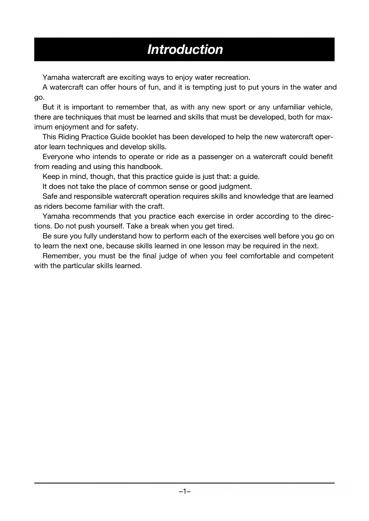 ©2021 by Yamaha Motor Co., Ltd. 1st Edition, April 2020 All rights reserved. Any reprinting or unauthorized use without the written permission of Yamaha Motor Co., Ltd. is expressly prohibited. Printed in U.S.A. E_F3Y-73-forPrint.book Page 1 Friday, June 19, 2020 4:23 PM–1– Introduction Yamaha watercraft are exciting ways to enjoy water recreation. A watercraft can offer hours of fun, and it is tempting just to put yours in the water and go. But it is important to remember that, as with any new sport or any unfamiliar vehicle, there are techniques that must be learned and skills that must be developed, both for max- imum enjoyment and for safety. This Riding Practice Guide booklet has been developed to help the new watercraft oper- ator learn techniques and develop skills. Everyone who intends to operate or ride as a passenger on a watercraft could benefit from reading and using this handbook. Keep in mind, though, that this practice guide is just that: a guide. It does not take the place of common sense or good judgment. Safe and responsible watercraft operation requires skills and knowledge that are learned as riders become familiar with the craft. Yamaha recommends that you practice each exercise in order according to the direc- tions. Do not push yourself. Take a break when you get tired. Be sure you fully understand how to perform each of the exercises well before you go on to learn the next one, because skills learned in one lesson may be required in the next. Remember, you must be the final judge of when you feel comfortable and competent with the particular skills learned. E_F3Y-73-forPrint.book Page 1 Friday, June 19, 2020 4:23 PM–2– Important information This practice guide does not replace the Owner’s/Operator’s Manual or the labels on the watercraft. Be sure to study these instructional materials thoroughly before you begin to oper- ate this watercraft. WWARNING Collisions result in more injuries and deaths than any other type of accident for per- sonal watercraft (PWC). To avoid collisions: Scan constantly for people, objects, and other watercraft. Be alert for conditions that limit your visibility or block your vision of others. Operate defensively at safe speeds and keep a safe distance away from people, objects, and other watercraft. Do not follow directly behind PWCs or other boats. Do not go near others to spray or splash them with water, go too close to other boats, or go too fast for the traffic conditions. Avoid areas with submerged objects or shallow water. EX / EX SPORT: Avoid sharp turns or other maneuvers that make it hard for others to avoid you or understand where you are going. EX DELUXE / EX LIMITED: Avoid sharp turns, slowing down rapidly by squeezing the Reverse with Intuitive Deceleration Electronics (RiDE) lever forcefully, and other maneuvers that make it hard for others to avoid you or understand where you are going. The RiDE system is an electronic system for controlling the engine speed and reverse gate, which is located near the jet thrust nozzle. The RiDE lever located at the left handlebar grip can be used to change the direction of the jet thrust so that the watercraft moves in reverse or is in neutral. The RiDE system assists the oper- ator when slowing down and during slow-speed maneuvering, such as launching, beaching, and docking. Take early action to avoid collisions. Remember, PWCs and other boats do not have brakes. EX DELUXE / EX LIMITED: The RiDE system is not a braking device for avoiding dan- gerous situations. E_F3Y-73-forPrint.book Page 2 Friday, June 19, 2020 4:23 PM–3– Important information Do not release the throttle lever when trying to steer away from objects—as with other powerboats, you need throttle to steer. Always check throttle and steering con- trols for proper operation before starting PWC. Follow navigation rules and local laws that apply to PWCs. See Owner’s Manual for more information. E_F3Y-73-forPrint.book Page 3 Friday, June 19, 2020 4:23 PM–4– How to use this guide to practice The Yamaha watercraft you are going to learn to operate may have different specifica- tions and different performance characteristics from other personal watercraft or boats you may have operated. The riding practice steps in this booklet will help you to become familiar with the basic techniques you will need to learn to master operating your watercraft. Remember, you will be learning the skills and developing the good judgment that safe operation of your watercraft requires. The purpose of this guide is to help you get started by practicing certain important skills. You should practice each exercise until you can do it well—until it feels comfortable to you. Only then should you go on to the next exercise. Each exercise builds on the skills you have already learned; so do not try to jump ahead. In these exercises, we want you to get the feel of the watercraft, and to learn how it operates in its many modes of use. Always keep in mind that these exercises are only a beginning and a guide. You must use your common sense and good judgment, along with the skill and knowledge you gain as you continue to operate your watercraft. This practice guide is divided into 9 exercises. Practice operating the watercraft in steps, starting with Exercise 1. Exercises 1 through 7 cover the basic riding techniques you need to master. Exercise 9 will help you learn the skills you need for operating with passengers. Again, do not attempt this exercise until you have developed your skills in the earlier exercises. Before starting the exercises read this guide completely. Then read the exercise again before you start to practice it. In this guide we refer to different speeds. E_F3Y-73-forPrint.book Page 4 Friday, June 19, 2020 4:23 PM–5– How to use this guide to practice Here is an explanation of what we mean by each: “Trolling” is the lowest maneuvering speed. You are applying little or no throttle. The watercraft is down in the
