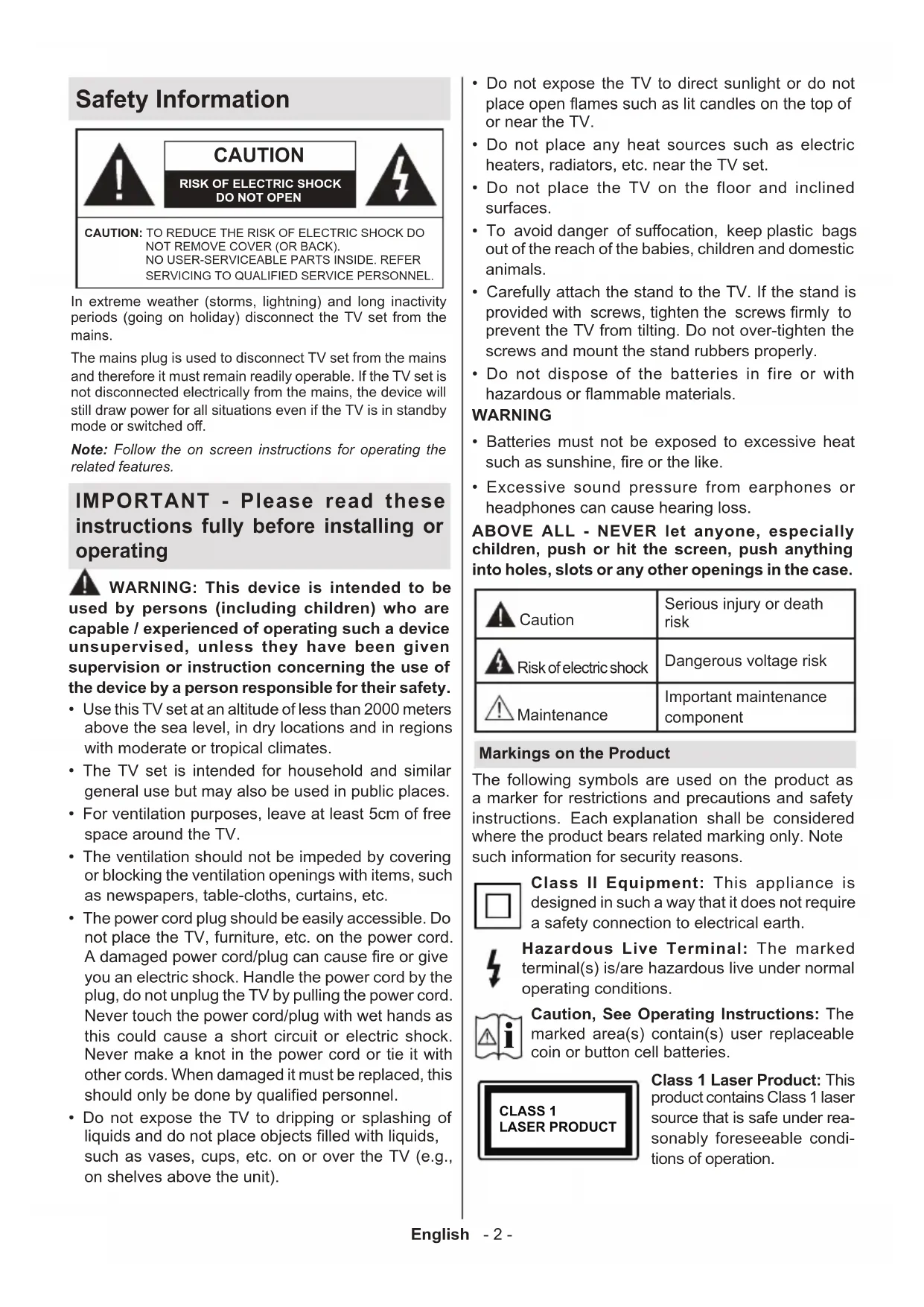 Class 1 Laser Product: This product contains Class 1 laser source that is safe under rea- sonably foreseeable condi- tions of operation.English - 3 - WARNING Do not ingest the battery, Chemical Burn Hazard This product or the accessories supplied with the prod- uct may contain a coin/button cell battery. If the coin/ button cell battery is swallowed, it can cause severe internal burns in just 2 hours and can lead to death. Keep new and used batteries away from children. If the battery compartment does not close securely, stop using the product and keep it away from children. If you think batteries might have been swallowed or placed inside any part of the body, seek immediate medical attention. – – – – – – – – – – – – A television may fall, causing serious personal injury or death. Many injuries, particularly to children, can be avoided by taking simple precautions such as:
