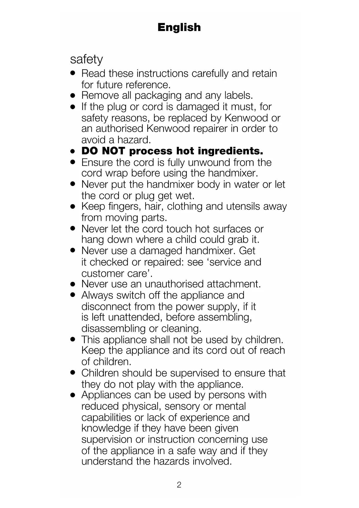 If the plug or cord is damaged it must, for safety reasons, be replaced by Kenwood or an authorised Kenwood repairer in order to avoid a hazard.