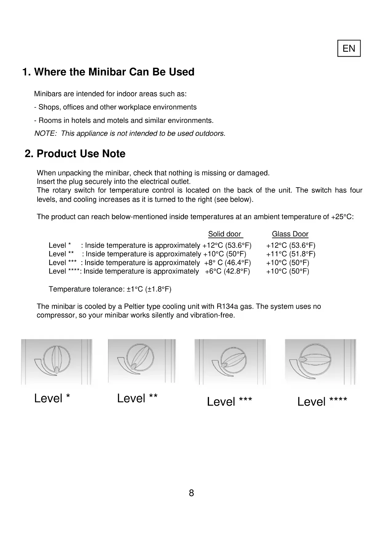 The minibar is cooled by a Peltier type cooling unit with R134a gas. The system uses no compressor, so your minibar works silently and vibration-free.