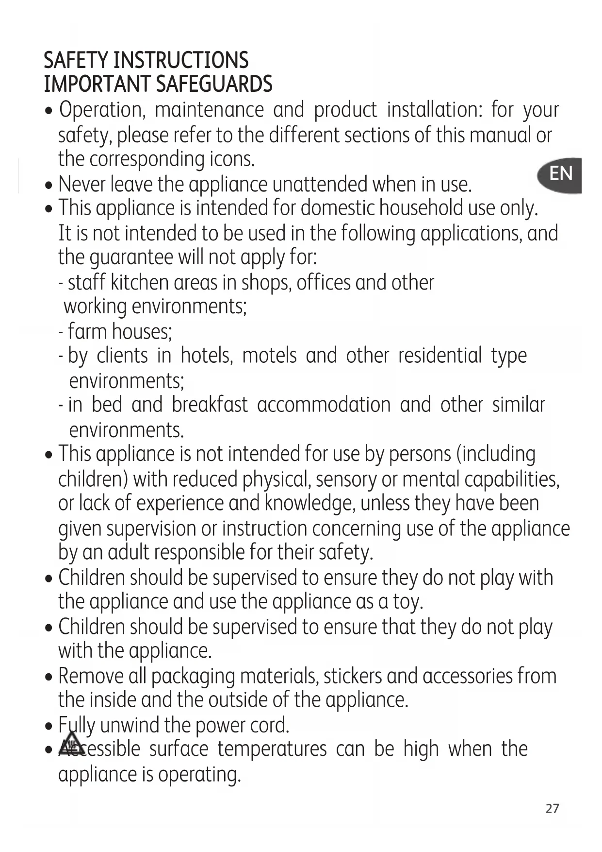- This appliance may be used by persons with reduced physical, sensory or mental capacities, or by persons with little or no knowledge of the appliance, as long as they are under proper supervision or have received instructions on the safe use of the