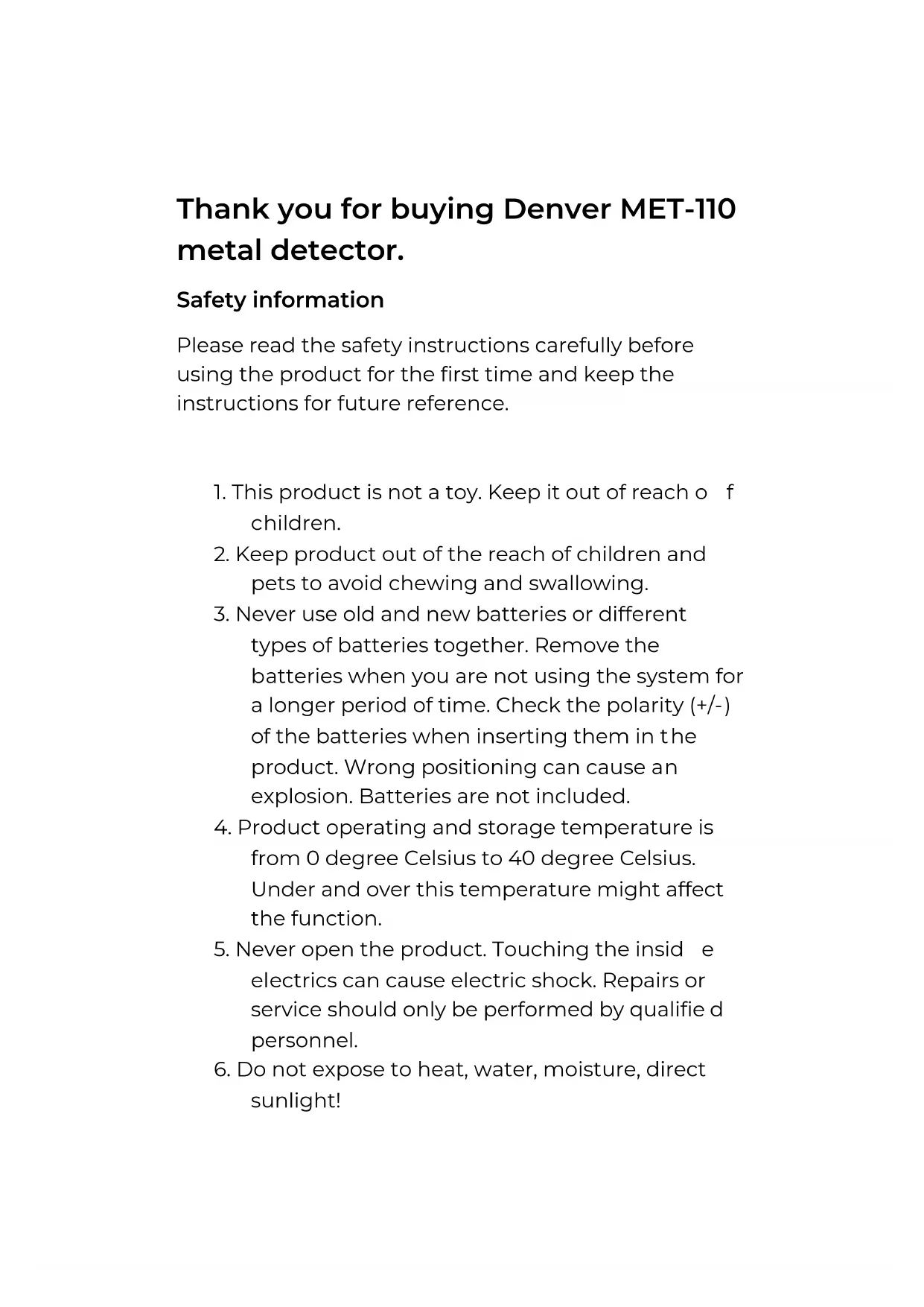 MET-110 Manual denver.eu 2021Thank you for buying Denver MET-110 metal detector. Safety information Please read the safety instructions carefully before using the product for the first time and keep the instructions for future reference.