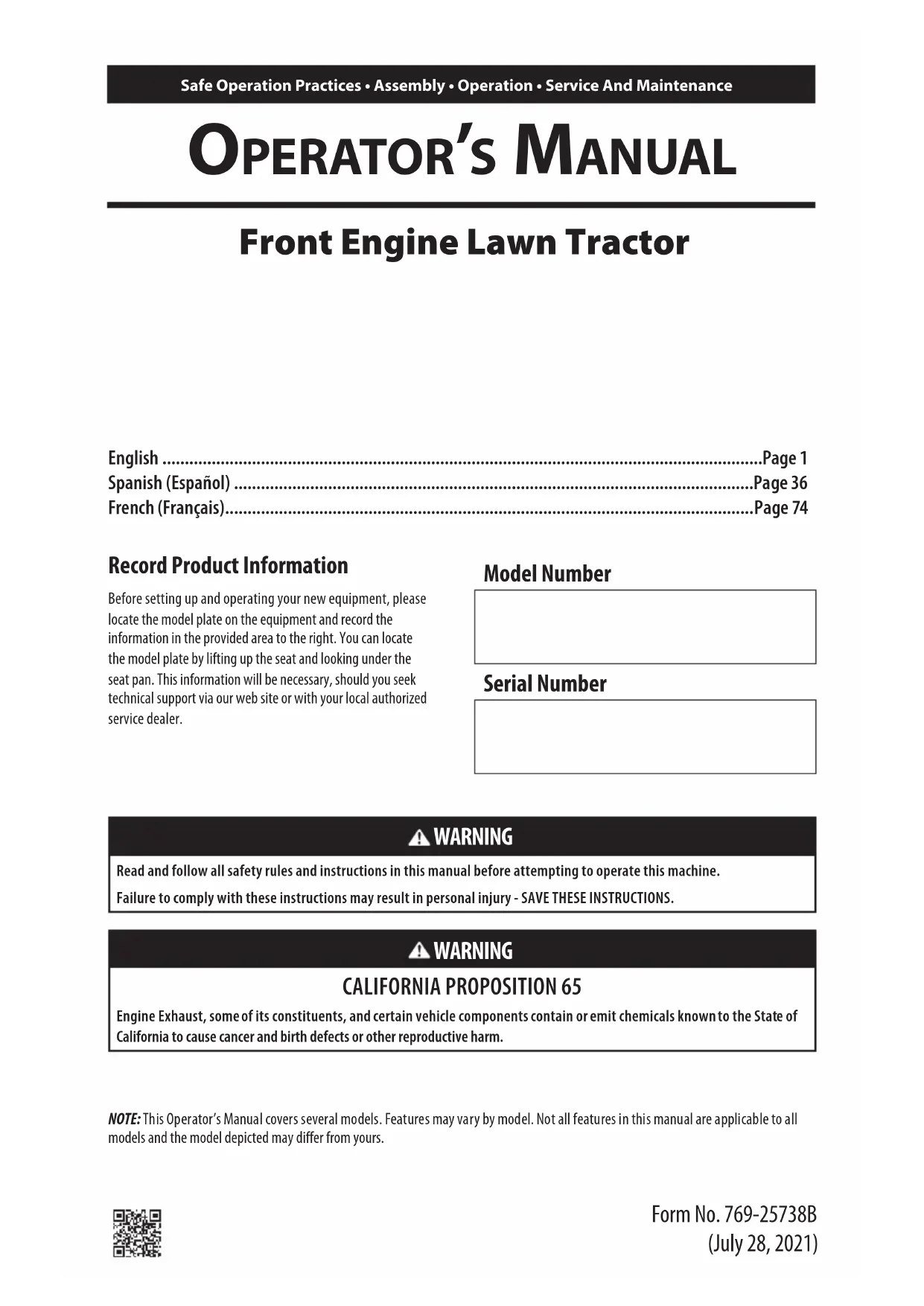 NOTE: This Operator's Manual covers several models. Features may vary by model. Not all features in this manual are applicable to all models and the model depicted may differ from yours.