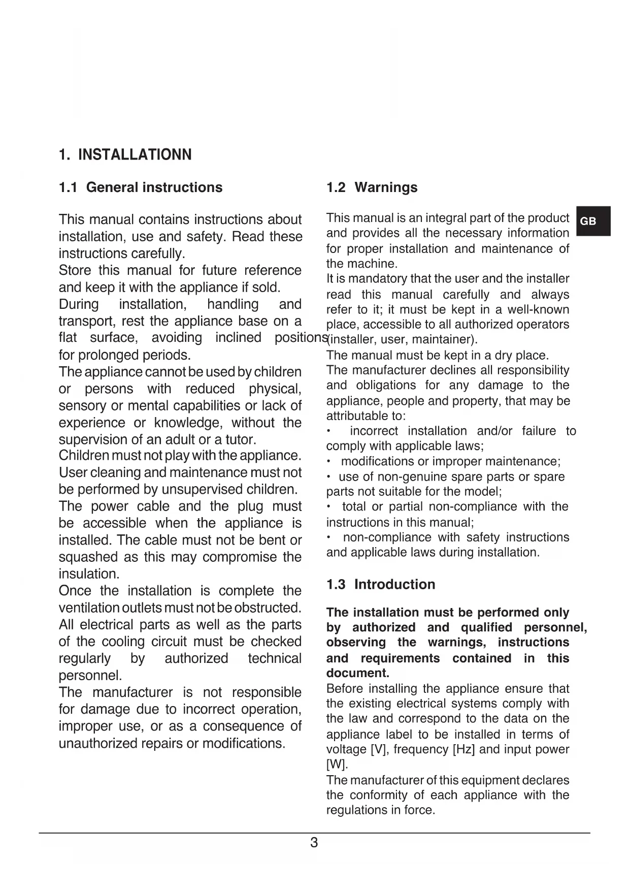 This manual is an integral part of the product and provides all the necessary information for proper installation and maintenance of the machine. It is mandatory that the user and the installer read this manual carefully and always refer to it; it must be kept in a well-known place, accessible to all authorized operators (installer, user, maintainer). The manual must be kept in a dry place. The manufacturer declines all responsibility and obligations for any damage to the appliance, people and property, that may be attributable to: