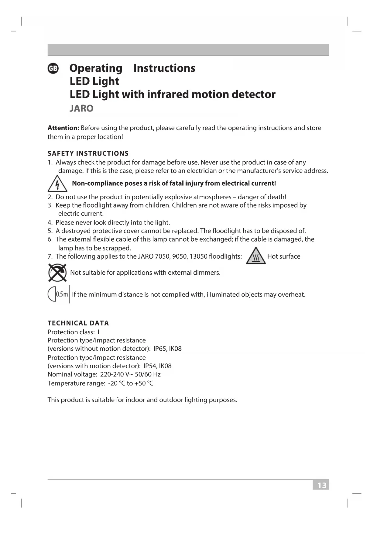 Hot surface Not suitable for applications with external dimmers. If the minimum distance is not complied with, illuminated objects may overheat. TECHNICAL DATA Protection class: I Protection type/impact resistance (versions without motion detector): IP65, IK08 Protection type/impact resistance (versions with motion detector): IP54, IK08 Nominal voltage: 220-240 V~ 50/60 Hz Temperature range: -20 °C to +50 °C This product is suitable for indoor and outdoor lighting purposes. 20P114 LED Strahler Jaro PIR 0533228 210327.indd 13 27.03.2021 16:10:471414 Operating Instructions JARO INSTALLATION AND CONNECTION TO POWER SUPPLY 10 – 50 W see gures p. 4, 7 and 8