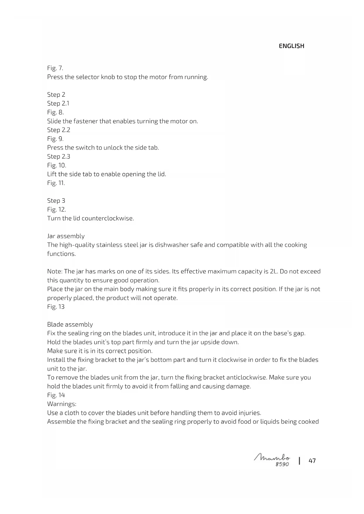 Lid assembly Step 1 Fig. 2. Place the lid on the jar, press it down until it is correctly xed and then, turn it counterclockwise. Step 2 Step 2.1 Fig. 3. Turn the side rotation-lock tab. Fig. 4. The switch will automatically return to the initial position, enabling moving the fastener. Step 2.3 Fig. 5. Slide the fastener that enables turning the motor on. Fig. 6. Opening the lid Step 147 ENGLISH Fig. 7. Press the selector knob to stop the motor from running. Step 2 Step 2.1 Fig. 8. Slide the fastener that enables turning the motor on. Step 2.2 Fig. 9. Press the switch to unlock the side tab. Step 2.3 Fig. 10. Lift the side tab to enable opening the lid. Fig. 11. Step 3 Fig. 12. Turn the lid counterclockwise. Jar assembly The high-quality stainless steel jar is dishwasher safe and compatible with all the cooking functions. Note: The jar has marks on one of its sides. Its effective maximum capacity is 2L. Do not exceed this quantity to ensure good operation. Place the jar on the main body making sure it ts properly in its correct position. If the jar is not properly placed, the product will not operate. Fig. 13 Blade assembly Fix the sealing ring on the blades unit, introduce it in the jar and place it on the base’s gap. Hold the blades unit’s top part rmly and turn the jar upside down. Make sure it is in its correct position. Install the xing bracket to the jar’s bottom part and turn it clockwise in order to x the blades unit to the jar. To remove the blades unit from the jar, turn the xing bracket anticlockwise. Make sure you hold the blades unit rmly to avoid it from falling and causing damage. Fig. 14 Warnings: Use a cloth to cover the blades unit before handling them to avoid injuries. Assemble the xing bracket and the sealing ring properly to avoid food or liquids being cooked48 ENGLISH from splattering. MamboMix Spoon This accessory is designed for kneading, stirring and mixing foods without cutting them. Remove the blades unit by holding them tightly, turning the jar upside down and turning the xing bracket anticlockwise.