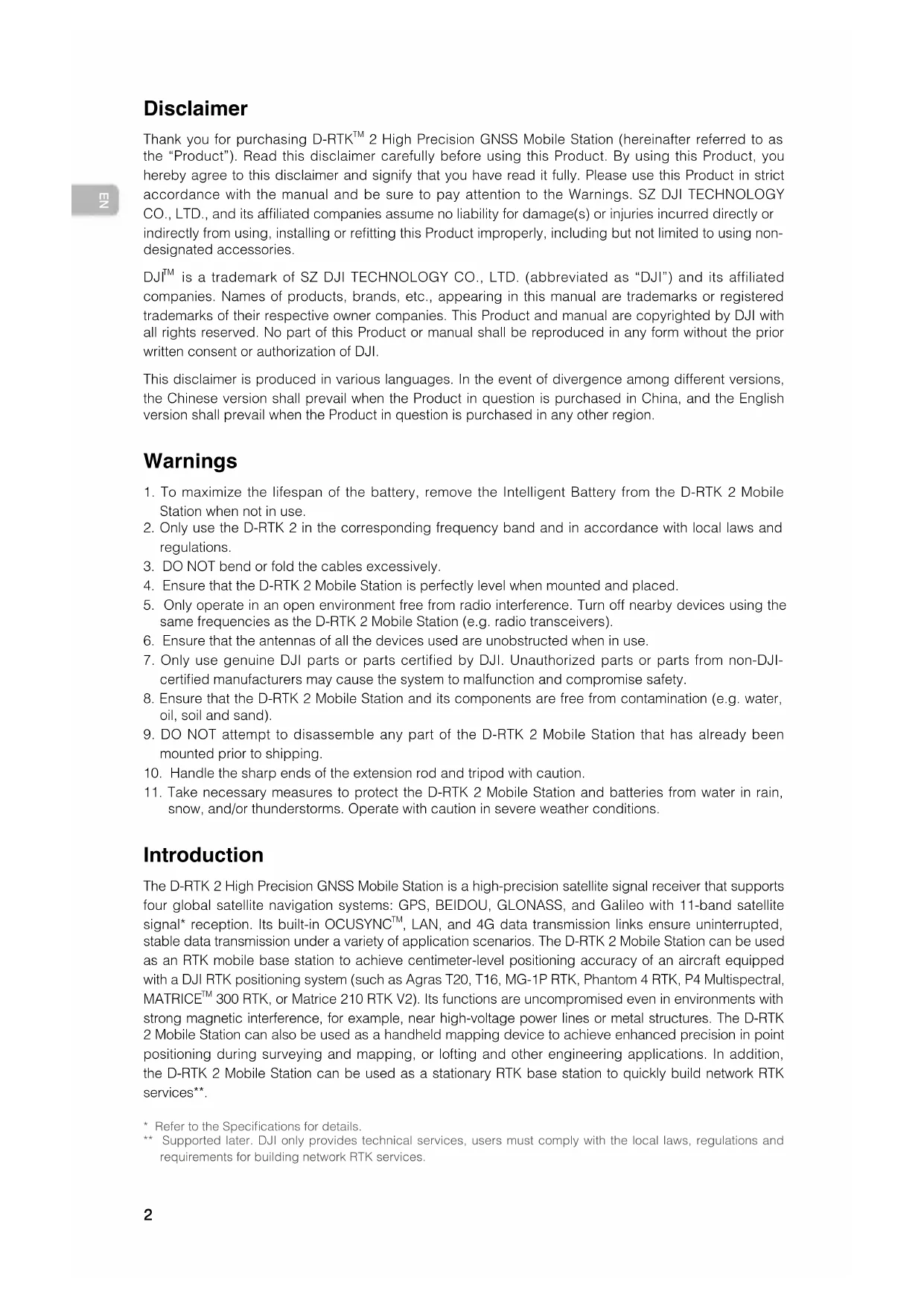 2 High Precision GNSS Mobile Station (hereinafter referred to as the “Product”). Read this disclaimer carefully before using this Product. By using this Product, you hereby agree to this disclaimer and signify that you have read it fully. Please use this Product in strict accordance with the manual and be sure to pay attention to the Warnings. SZ DJI TECHNOLOGY CO., LTD., and its afliated companies assume no liability for damage(s) or injuries incurred directly or indirectly from using, installing or retting this Product improperly, including but not limited to using non- designated accessories. DJI