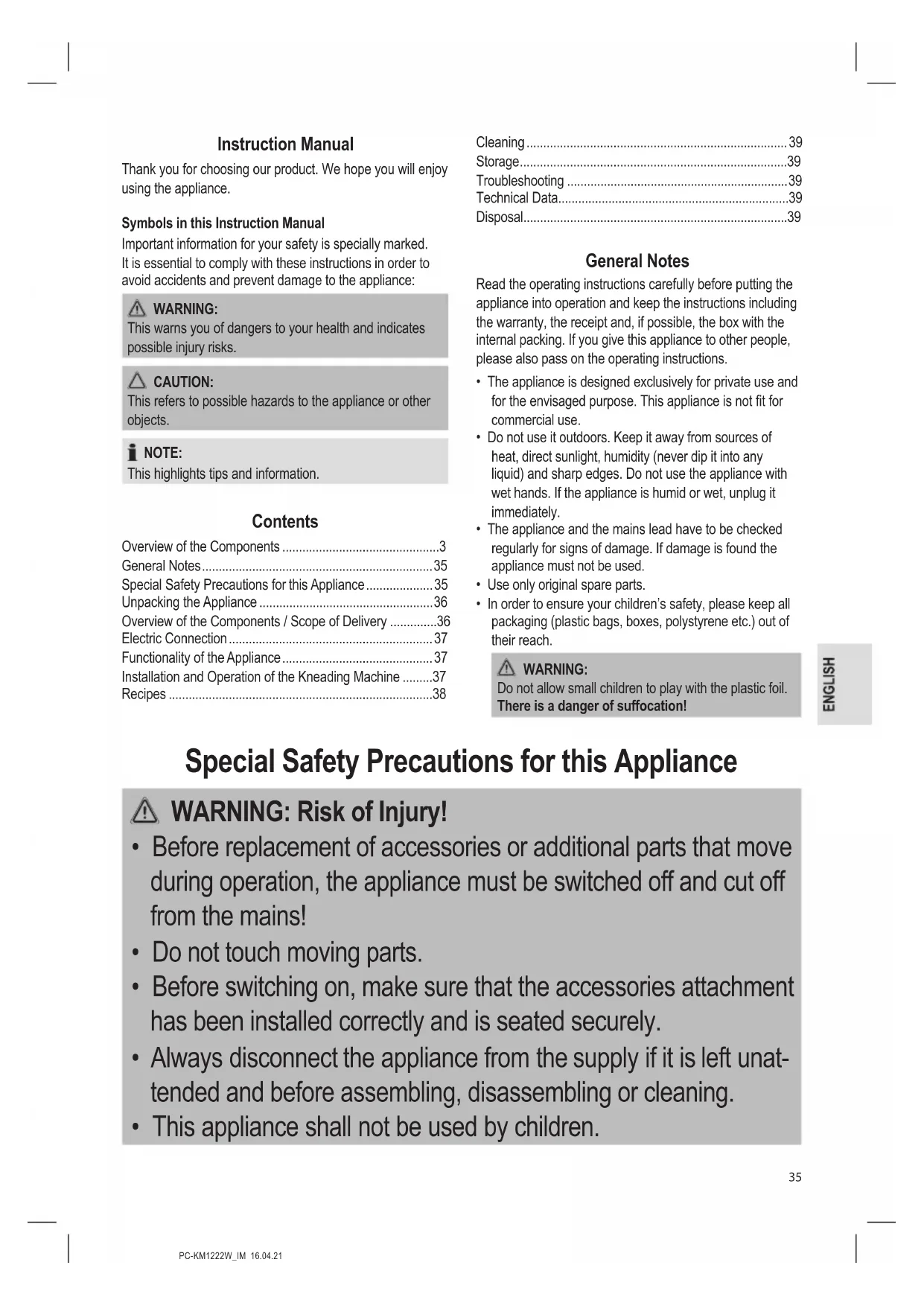 - Always store the appliance out of reach of children in a well ventilated, dry place. Troubleshooting Problem Possible Cause Solution The appliance can- not be switched on or stops operation. Appliance without power supply. Check the socket with another appliance. The swivel arm is not locked in the lowest position. A safety switch prevents operation. - Check the proper position of the swivelling arm. - Set the control knob in the 0 position. Then select the desired speed setting. The overheating protection has been activated. The motor is too hot. Let the appliance cool down for at least 15 minutes before switching it on again. The appliance is defective. Contact our service centre or a specialist. Technical Data Model:............................................................ PC-KM 1222 W Power supply:.....................................220 – 240 V~, 50 – 60 Hz Power consumption: ...................................................1200 W Protection class: ................................................................... Net weight: ...................................................... approx. 4,5 kg The right to make technical and design modications in the course of continuous product development remains reserved. This appliance has been tested according to all relevant current CE guidelines, such as electromagnetic compatibility and low voltage directives, and is manufactured according to the latest safety regulations. Disposal Meaning of the “Dustbin” Symbol Protect our environment: do not dispose of elec- trical equipment in the domestic waste. Please return any electrical equipment that you will no longer use to the collection points provided for their disposal. This helps avoid the potential effects of incorrect disposal on the environment and human health. This will contribute to the recycling and other forms of re-utilisation of electrical and electronic equipment. Information concerning where the equipment can be dis- posed of can be obtained from your local authority.PC-KM1222W_IM 16.04.21