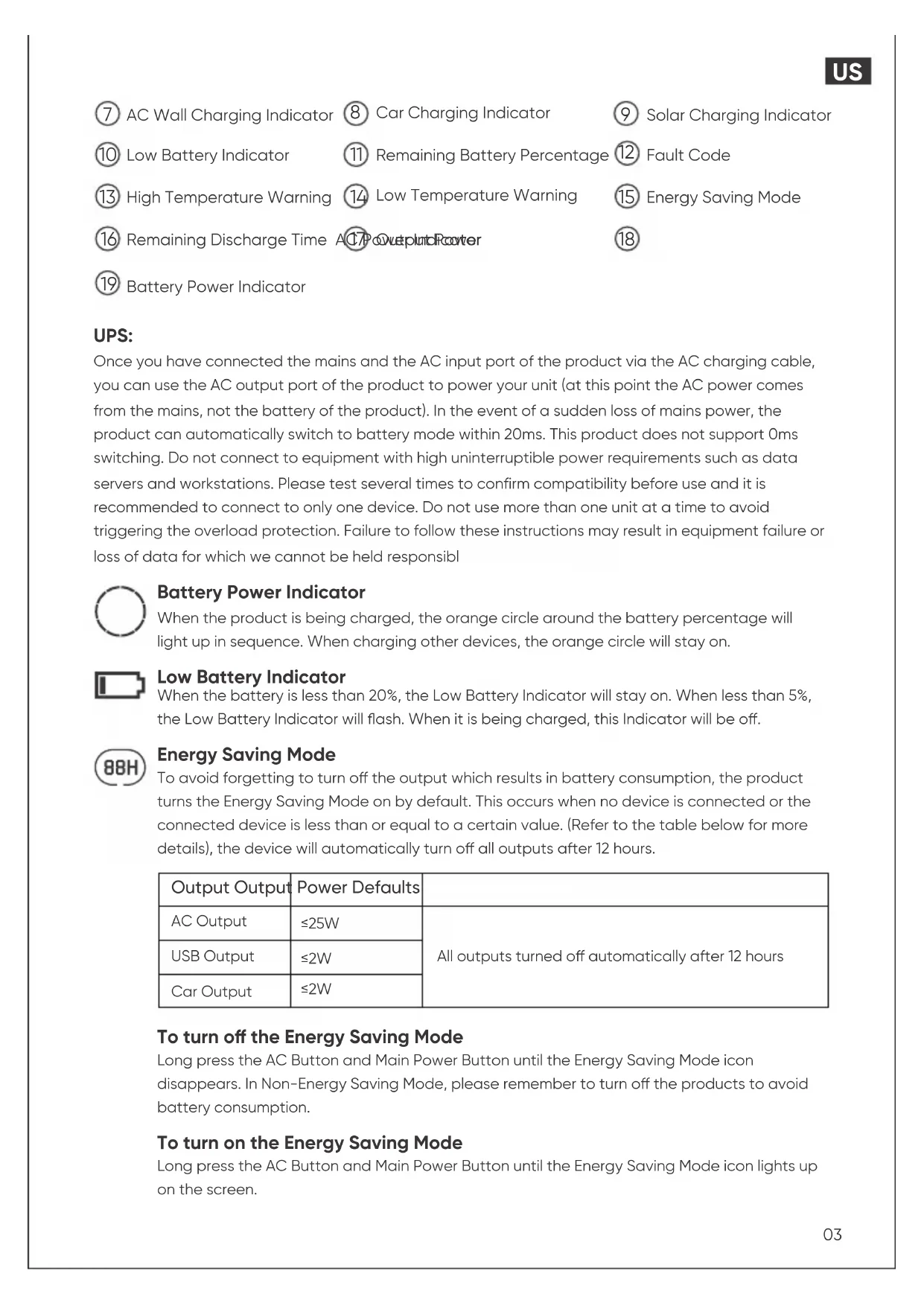 *In Energy Saving mode, turn on DC output or AC output, or it will automatically shut down after 12 hours if there is no charging input or discharging output.