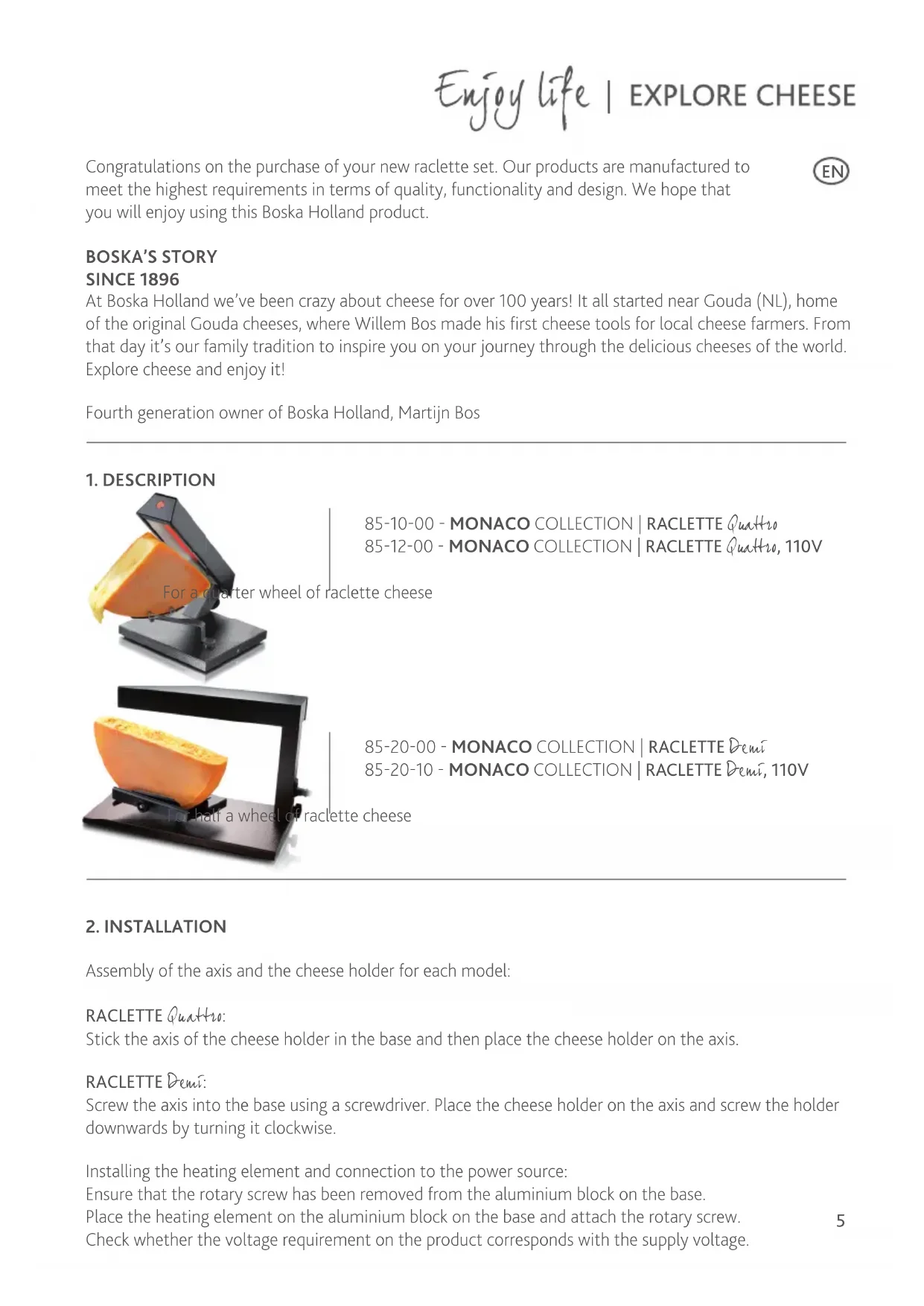 Congratulations on the purchase of your new raclette set. Our products are manufactured to meet the highest requirements in terms of quality, functionality and design. We hope that you will enjoy using this Boska Holland product.
