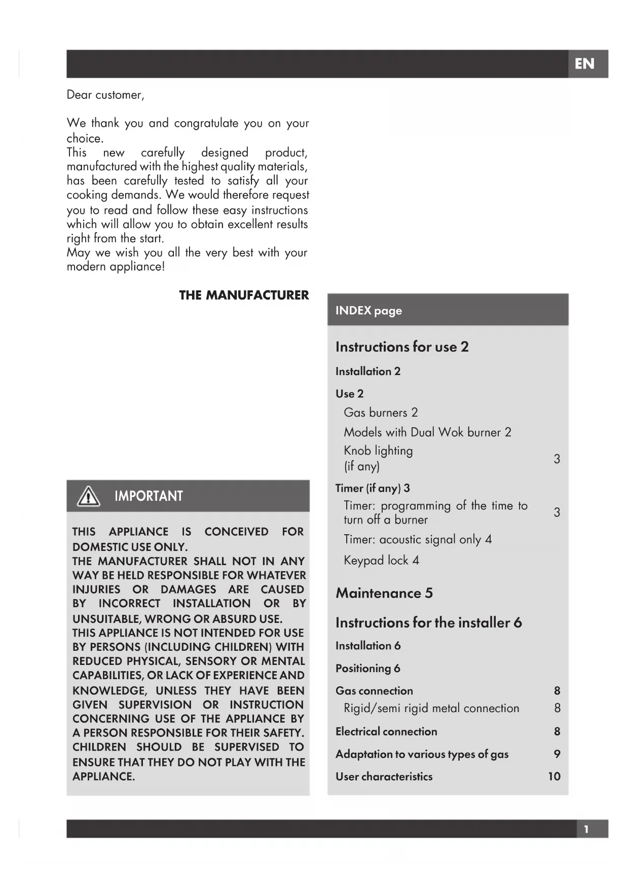 Timer: acoustic signal only 4 Keypad lock 4 Maintenance 5 Instructions for the installer 6 Installation 6 Positioning 6 Gas connection 8 Rigid/semi rigid metal connection 8 Electrical connection 8 Adaptation to various types of gas 9 User characteristics 10EN