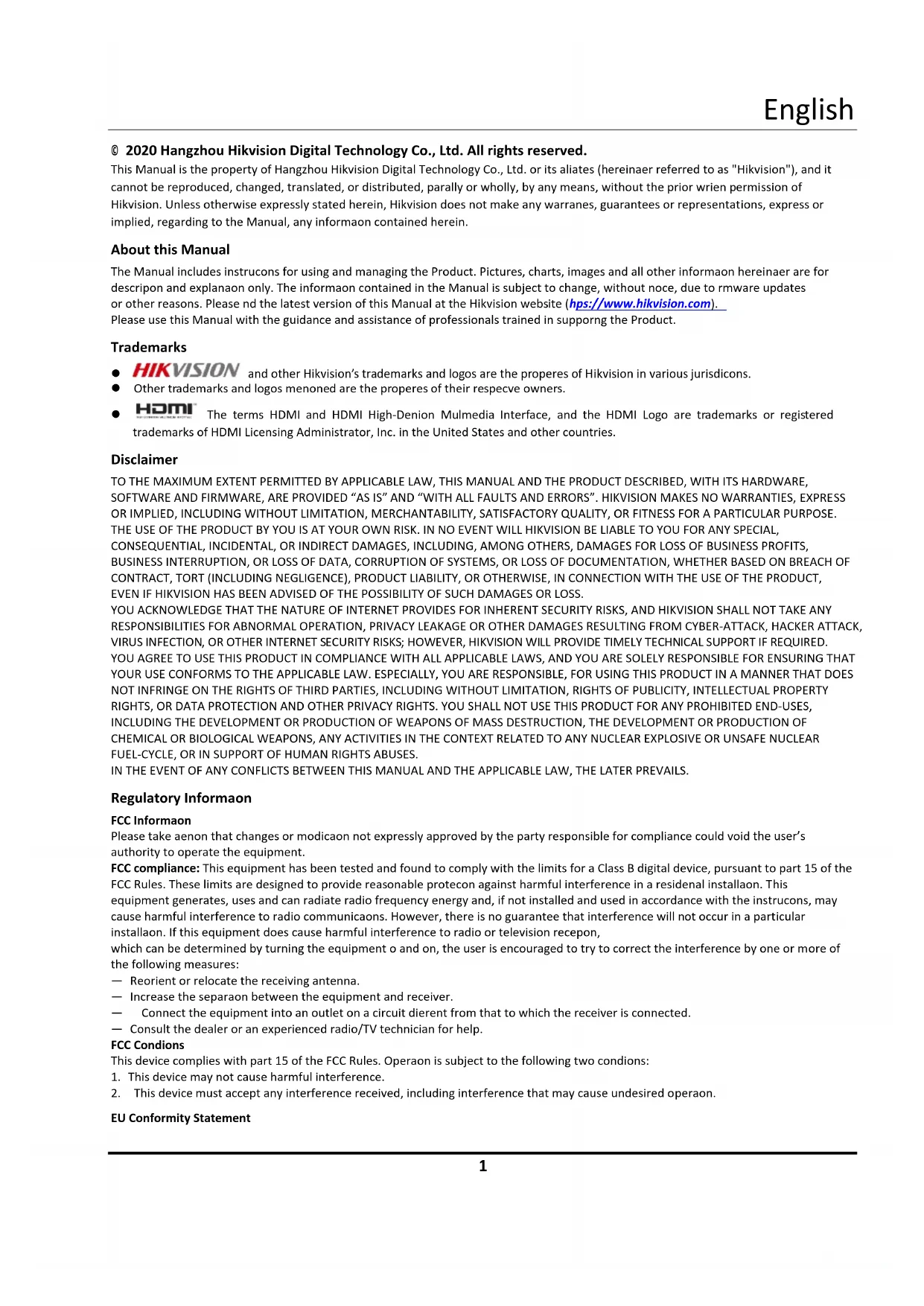 © 2020 Hangzhou Hikvision Digital Technology Co., Ltd. All rights reserved. This Manual is the property of Hangzhou Hikvision Digital Technology Co., Ltd. or its affiliates (hereinafter referred to as "Hikvision"), and it cannot be reproduced, changed, translated, or distributed, partially or wholly, by any means, without the prior written permission of Hikvision. Unless otherwise expressly stated herein, Hikvision does not make any warranties, guarantees or representations, express or implied, regarding to the Manual, any information contained herein. About this Manual The Manual includes instructions for using and managing the Product. Pictures, charts, images and all other information hereinafter are for description and explanation only. The information contained in the Manual is subject to change, without notice, due to firmware updates or other reasons. Please find the latest version of this Manual at the Hikvision website (https://www.hikvision.com). Please use this Manual with the guidance and assistance of professionals trained in supporting the Product. Trademarks and other Hikvision’s trademarks and logos are the properties of Hikvision in various jurisdictions. Other trademarks and logos mentioned are the properties of their respective owners. The terms HDMI and HDMI High-Definition Multimedia Interface, and the HDMI Logo are trademarks or registered trademarks of HDMI Licensing Administrator, Inc. in the United States and other countries. Disclaimer TO THE MAXIMUM EXTENT PERMITTED BY APPLICABLE LAW, THIS MANUAL AND THE PRODUCT DESCRIBED, WITH ITS HARDWARE, SOFTWARE AND FIRMWARE, ARE PROVIDED “AS IS” AND “WITH ALL FAULTS AND ERRORS”. HIKVISION MAKES NO WARRANTIES, EXPRESS OR IMPLIED, INCLUDING WITHOUT LIMITATION, MERCHANTABILITY, SATISFACTORY QUALITY, OR FITNESS FOR A PARTICULAR PURPOSE. THE USE OF THE PRODUCT BY YOU IS AT YOUR OWN RISK. IN NO EVENT WILL HIKVISION BE LIABLE TO YOU FOR ANY SPECIAL, CONSEQUENTIAL, INCIDENTAL, OR INDIRECT DAMAGES, INCLUDING, AMONG OTHERS, DAMAGES FOR LOSS OF BUSINESS PROFITS, BUSINESS INTERRUPTION, OR LOSS OF DATA, CORRUPTION OF SYSTEMS, OR LOSS OF DOCUMENTATION, WHETHER BASED ON BREACH OF CONTRACT, TORT (INCLUDING NEGLIGENCE), PRODUCT LIABILITY, OR OTHERWISE, IN CONNECTION WITH THE USE OF THE PRODUCT, EVEN IF HIKVISION HAS BEEN ADVISED OF THE POSSIBILITY OF SUCH DAMAGES OR LOSS. YOU ACKNOWLEDGE THAT THE NATURE OF INTERNET PROVIDES FOR INHERENT SECURITY RISKS, AND HIKVISION SHALL NOT TAKE ANY RESPONSIBILITIES FOR ABNORMAL OPERATION, PRIVACY LEAKAGE OR OTHER DAMAGES RESULTING FROM CYBER-ATTACK, HACKER ATTACK, VIRUS INFECTION, OR OTHER INTERNET SECURITY RISKS; HOWEVER, HIKVISION WILL PROVIDE TIMELY TECHNICAL SUPPORT IF REQUIRED. YOU AGREE TO USE THIS PRODUCT IN COMPLIANCE WITH ALL APPLICABLE LAWS, AND YOU ARE SOLELY RESPONSIBLE FOR ENSURING THAT YOUR USE CONFORMS TO THE APPLICABLE LAW. ESPECIALLY, YOU ARE RESPONSIBLE, FOR USING THIS PRODUCT IN A MANNER THAT DOES NOT INFRINGE ON THE RIGHTS OF THIRD PARTIES, INCLUDING WITHOUT LIMITATION, RIGHTS OF PUBLICITY, INTELLECTUAL PROPERTY RIGHTS, OR DATA PROTECTION AND OTHER PRIVACY RIGHTS. YOU SHALL NOT USE THIS PRODUCT FOR ANY PROHIBITED END-USES, INCLUDING THE DEVELOPMENT OR PRODUCTION OF WEAPONS OF MASS DESTRUCTION, THE DEVELOPMENT OR PRODUCTION OF CHEMICAL OR BIOLOGICAL WEAPONS, ANY ACTIVITIES IN THE CONTEXT RELATED TO ANY NUCLEAR EXPLOSIVE OR UNSAFE NUCLEAR FUEL-CYCLE, OR IN SUPPORT OF HUMAN RIGHTS ABUSES. IN THE EVENT OF ANY CONFLICTS BETWEEN THIS MANUAL AND THE APPLICABLE LAW, THE LATER PREVAILS. Regulatory Information FCC Information Please take attention that changes or modification not expressly approved by the party responsible for compliance could void the user’s authority to operate the equipment. FCC compliance: This equipment has been tested and found to comply with the limits for a Class B digital device, pursuant to part 15 of the FCC Rules. These limits are designed to provide reasonable protection against harmful interference in a residential installation. This equipment generates, uses and can radiate radio frequency energy and, if not installed and used in accordance with the instructions, may cause harmful interference to radio communications. However, there is no guarantee that interference will not occur in a particular installation. If this equipment does cause harmful interference to radio or television reception, which can be determined by turning the equipment off and on, the user is encouraged to try to correct the interference by one or more of the following measures: — Reorient or relocate the receiving antenna. — Increase the separation between the equipment and receiver. — Connect the equipment into an outlet on a circuit different from that to which the receiver is connected. — Consult the dealer or an experienced radio/TV technician for help. FCC Conditions This device complies with part 15 of the FCC Rules. Operation is subject to the following two conditions: 1. This device may not cause harmful interference.