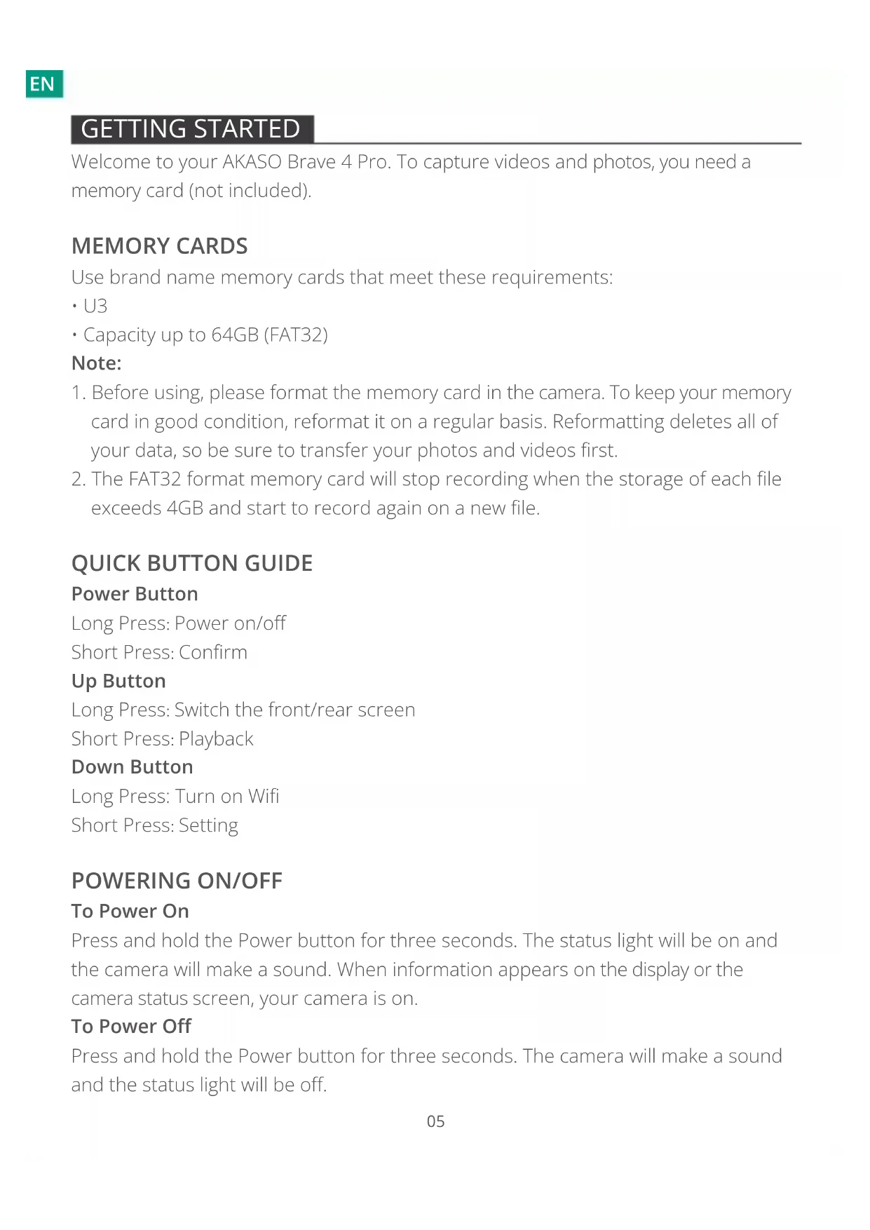 20 21 22GETTING STARTED Welcome to your AKASO Brave 4 Pro. To capture videos and photos, you need a memory card (not included). MEMORY CARDS Use brand name memory cards that meet these requirements: