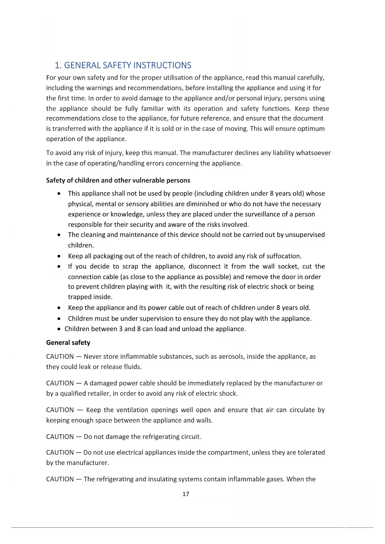 - Children between 3 and 8 can load and unload the appliance. General safety CAUTION — Never store inflammable substances, such as aerosols, inside the appliance, as they could leak or release fluids. CAUTION — A damaged power cable should be immediately replaced by the manufacturer or by a qualified retailer, in order to avoid any risk of electric shock. CAUTION — Keep the ventilation openings well open and ensure that air can circulate by keeping enough space between the appliance and walls. CAUTION — Do not damage the refrigerating circuit. CAUTION — Do not use electrical appliances inside the compartment, unless they are tolerated by the manufacturer. CAUTION — The refrigerating and insulating systems contain inflammable gases. When the18 appliance is scrapped, it should be deposited at an accredited collection centre. Do not expose the appliance to fire. CAUTION - Refrigerating appliance without 4 stars compartment are not suitable for freezing foodstuffs. CAUTION - This appliance is intended to be used in household and similar applications such as: ✓ staff kitchen areas in shops, offices and other working environments; ✓ farm houses and by clients in hotels, motels and other residential type environments; ✓ bed and breakfast type environments; ✓ catering and similar non-retail applications. Refrigerating fluid The refrigerating circuit in the appliance uses refrigerating isobutane (R600a), which is a natural gas respectful of the environment but highly inflammable. When transporting or installing the appliance, ensure that no element of the refrigerating circuit is damaged. The refrigerating fluid (R600a) is inflammable. Caution: Fire risk If the refrigerating circuit is damaged:
