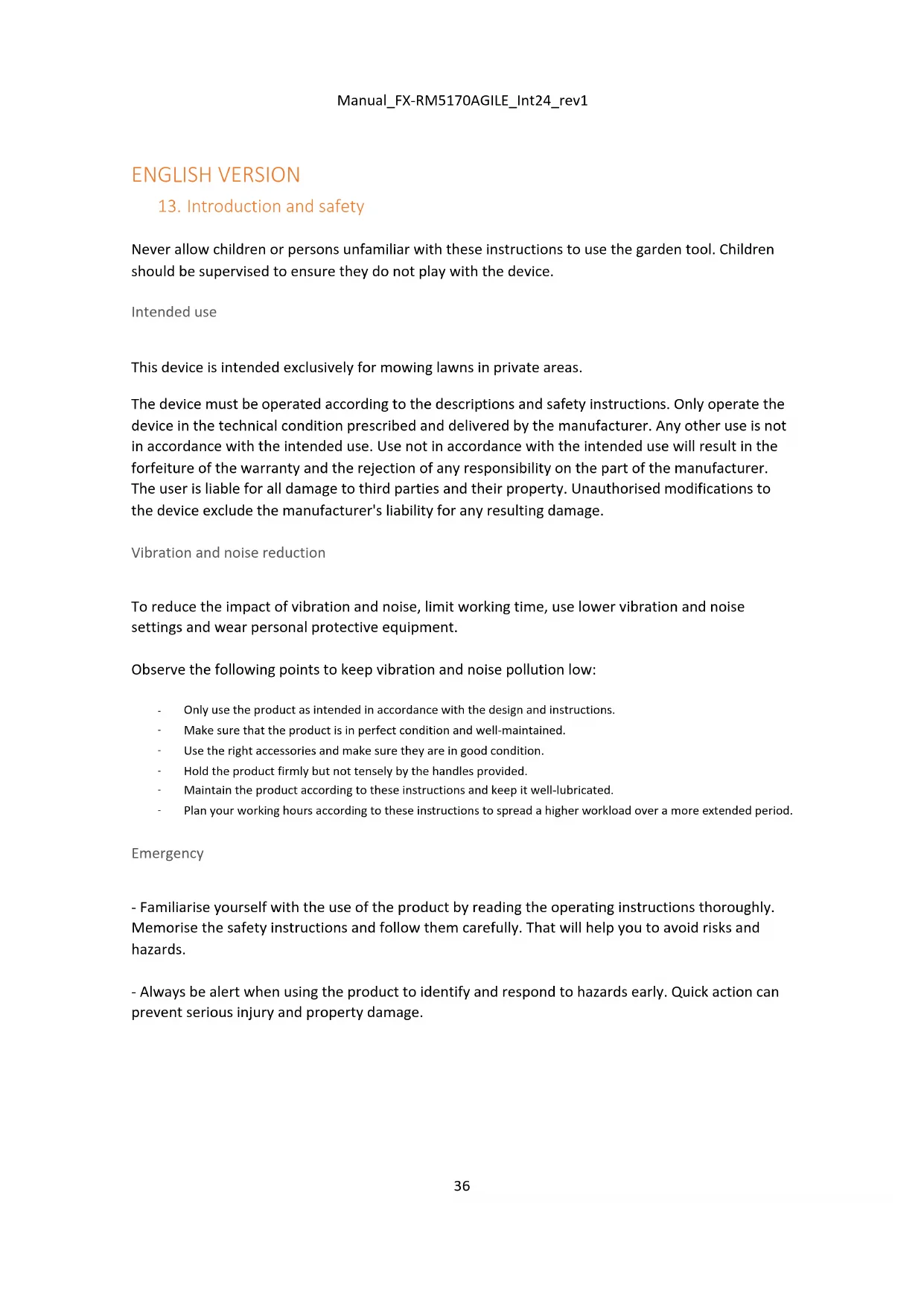 General safety instructions - For your safety and the safety of others, read this instruction manual and its safety instructions before using the device. Please keep the operating instructions and safely store their safety instructions for later use and keep these for ready to hand for every use. - Pass on the operating instructions with the device if there is a change of ownership. - Persons operating the device must not be under the influence of intoxicants (e.g. alcohol, drugs or medication). - Operate the device only in the technical condition prescribed and supplied by the manufacturer. Unauthorised modifications to the device exclude the manufacturer's liability for any resulting damage. - Use the device only in daylight or under good artificial lighting. - Use the device only in dry weather conditions. Please keep it away from rain or wet conditions. The ingress of water into the device increases the risk of electric shock. - Switch off the device and remove the battery in the following conditions: ⬧ if the device is left unattended ⬧ if the device starts to vibrate excessively. Before use - Before starting work, familiarise yourself with the device and its functions and controls. - Check the device for signs of wear or damage before commissioning and after an impact. - Do not use a device whose switch is defective and can no longer be switched on or off. - Check that all nuts, bolts and screws are tight to ensure that the device is operated safely.Manual_FX-RM5170AGILE_Int24_rev1