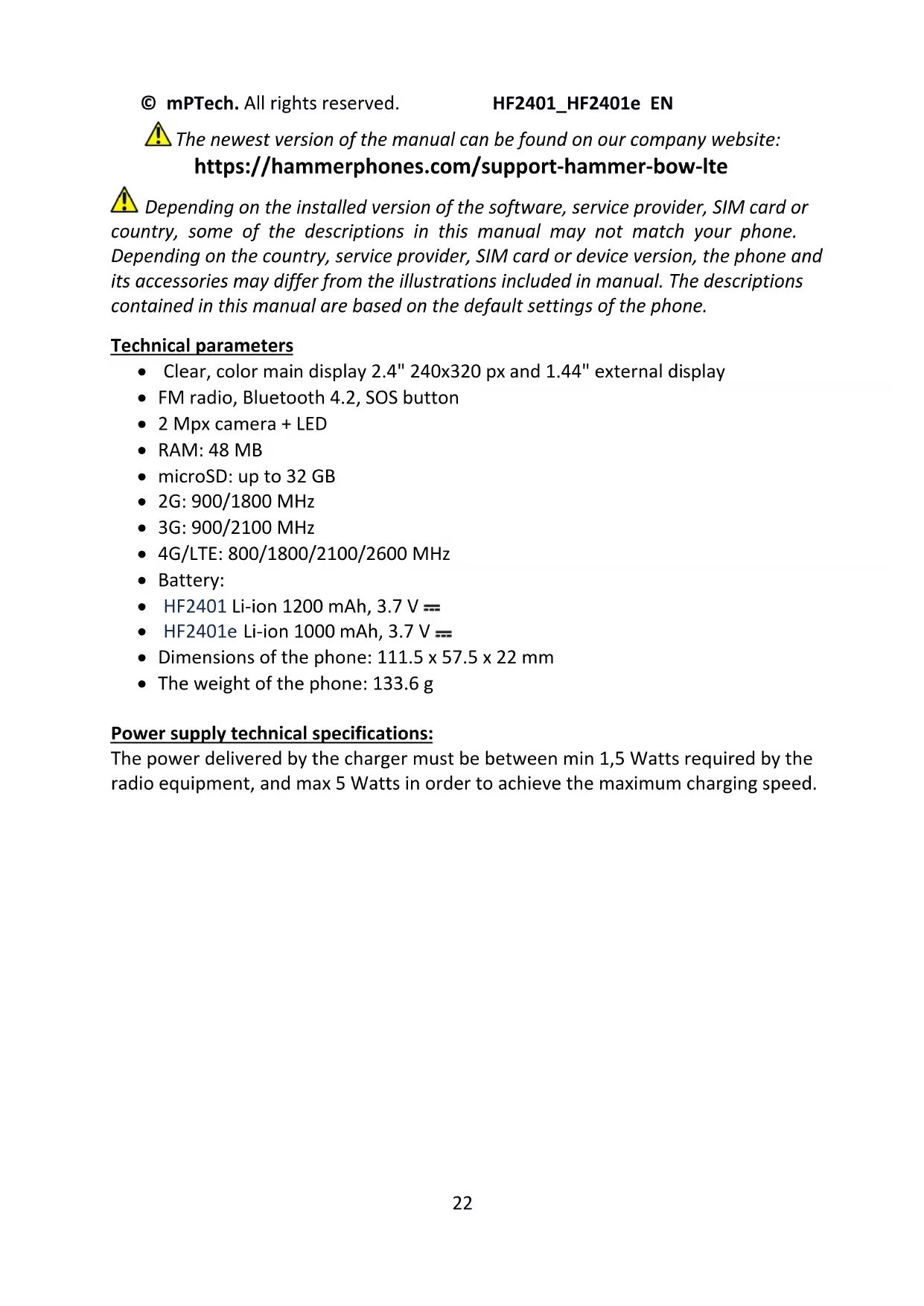 The newest version of the manual can be found on our company website: https://hammerphones.com/support-hammer-bow-lte Depending on the installed version of the software, service provider, SIM card or country, some of the descriptions in this manual may not match your phone. Depending on the country, service provider, SIM card or device version, the phone and its accessories may differ from the illustrations included in manual. The descriptions contained in this manual are based on the default settings of the phone. Technical parameters