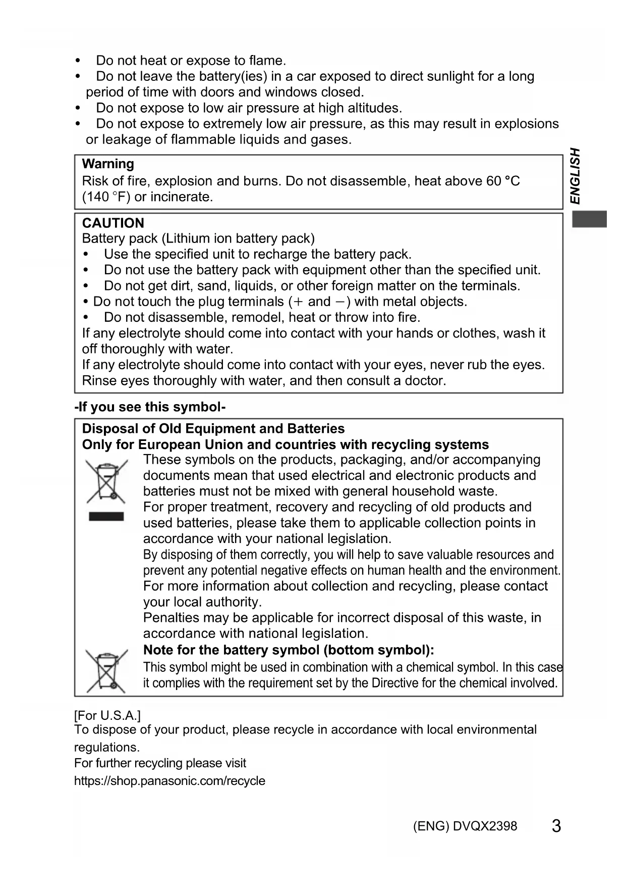 (ENG) DVQX2398 0 Do not heat or expose to flame. 0 Do not leave the battery(ies) in a car exposed to direct sunlight for a long period of time with doors and windows closed. 0 Do not expose to low air pressure at high altitudes. 0 Do not expose to extremely low air pressure, as this may result in explosions or leakage of flammable liquids and gases. -If you see this symbol- [For U.S.A.] To dispose of your product, please recycle in accordance with local environmental regulations. For further recycling please visit https://shop.panasonic.com/recycle Warning Risk of fire, explosion and burns. Do not disassemble, heat above 60 xC (140 oF) or incinerate. CAUTION Battery pack (Lithium ion battery pack) 0 Use the specified unit to recharge the battery pack. 0 Do not use the battery pack with equipment other than the specified unit. 0 Do not get dirt, sand, liquids, or other foreign matter on the terminals. 0 Do not touch the plug terminals (i and j) with metal objects. 0 Do not disassemble, remodel, heat or throw into fire. If any electrolyte should come into contact with your hands or clothes, wash it off thoroughly with water. If any electrolyte should come into contact with your eyes, never rub the eyes. Rinse eyes thoroughly with water, and then consult a doctor. Disposal of Old Equipment and Batteries Only for European Union and countries with recycling systems These symbols on the products, packaging, and/or accompanying documents mean that used electrical and electronic products and batteries must not be mixed with general household waste. For proper treatment, recovery and recycling of old products and used batteries, please take them to applicable collection points in accordance with your national legislation. By disposing of them correctly, you will help to save valuable resources and prevent any potential negative effects on human health and the environment. For more information about collection and recycling, please contact your local authority. Penalties may be applicable for incorrect disposal of this waste, in accordance with national legislation. Note for the battery symbol (bottom symbol): This symbol might be used in combination with a chemical symbol. In this case it complies with the requirement set by the Directive for the chemical involved. DMW-BG1-DVQX2398.book 3 ページ 2023年8月24日 木曜日 午後3時18分4 DVQX2398 (ENG) [India Only] Information on hazardous constituents as specified in sub-rule1 of rule16 in electrical and electronic equipment. Declaration of Conformity with the requirements of the E-Waste (Management) Amendment Rules, 2023 with the sub-rule1 of rule16 limits with respect to Lead, Mercury, Cadmium, Hexavalent chromium, Polybrominated biphenyls, Polybrominated diphenyl ethers. The content of hazardous substance with the exemption of the applications listed in SCHEDULE II of the E-Waste (Management) Amendment Rules, 2023: