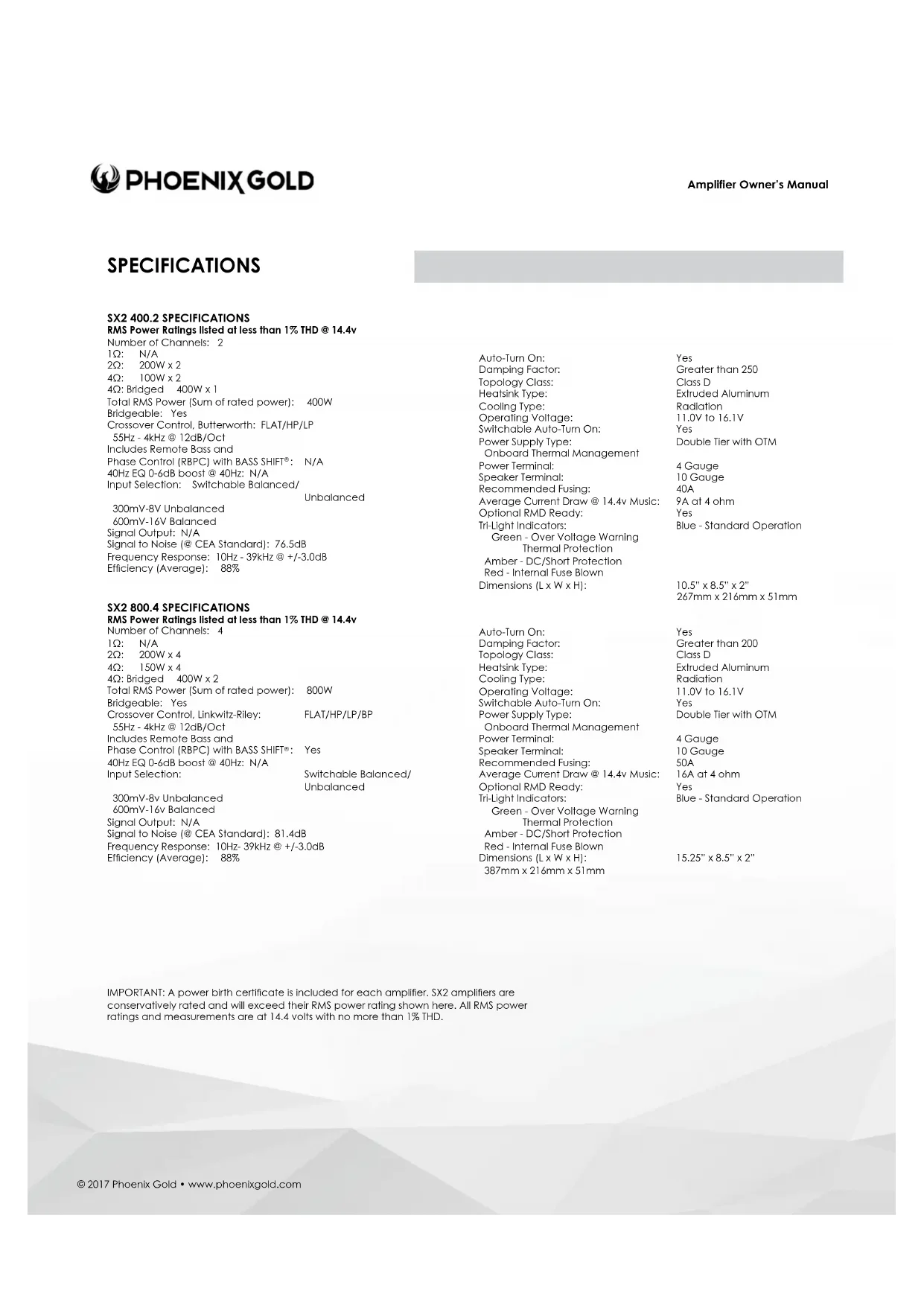 : Yes 40Hz EQ 0-6dB boost @ 40Hz: N/A Input Selection: Switchable Balanced/ Unbalanced 300mV-8v Unbalanced 600mV-16v Balanced Signal Output: N/A Signal to Noise (@ CEA Standard): 81.4dB Frequency Response: 10Hz- 39kHz @ +/-3.0dB Efciency(Average): 88% Auto-Turn On: Yes Damping Factor: Greater than 200 MASTER/SLAVECapable: Yes-1200Wx1@2ΩStrapped Topology Class: Class D Heatsink Type: Extruded Aluminum Cooling Type: Radiation Operating Voltage: 11.0V to 16.1V Switchable Auto-Turn On: Yes Power Supply Type: Double Tier with OTM Onboard Thermal Management Power Terminal: 4 Gauge Speaker Terminal: 10 Gauge Recommended Fusing: 60A Average Current Draw @ 14.4v Music: 15A at 4 ohm Optional RMD Ready: Yes Tri-Light Indicators: Blue - Standard Operation Green-OverVoltageWarning Thermal Protection Amber - DC/Short Protection Red - Internal Fuse Blown Dimensions(LxWxH): 13.25”x8.5”x2” 337mm x 216mm x 51mm Auto-Turn On: Yes Damping Factor: Greater than 200 MASTER/SLAVECapable: Yes-2400Wx1@2ΩStrapped Topology Class: Class D Heatsink Type: Extruded Aluminum Cooling Type: Radiation Operating Voltage: 11.0V to 16.1V Switchable Auto-Turn On: Yes Power Supply Type: Double Tier with OTM Onboard Thermal Management Power Terminal: 4 Gauge Speaker Terminal: 10 Gauge Recommended Fusing: 80A Average Current Draw @ 14.4v Music: 26A at 4 ohm Optional RMD Ready: Yes Tri-Light Indicators: Blue - Standard Operation Green-OverVoltageWarning Thermal Protection Amber - DC/Short Protection Red - Internal Fuse Blown Dimensions(LxWxH): 16.75”x8.5”x2” 425mm x 216mm x 51mm Auto-Turn On: Yes Damping Factor: Greater than 200 Topology Class: Class D Heatsink Type: Extruded Aluminum Cooling Type: Radiation Operating Voltage: 11.0V to 16.1V Switchable Auto-Turn On: Yes Power Supply Type: Double Tier with OTM Onboard Thermal Management Power Terminal: 4 Gauge Speaker Terminal: 10 Gauge Recommended Fusing: 70A Average Current Draw @ 14.4v Music: 24A at 4 ohm Optional RMD Ready: Yes Tri-Light Indicators: Blue - Standard Operation Green-OverVoltageWarning Thermal Protection Amber - DC/Short Protection Red - Internal Fuse Blown Dimensions(LxWxH): 19.25”x8.5”x2” 489mm x 216mm x 51mm SPECIFICATIONSAmplifier Owner’s Manual © 2017 Phoenix Gold • www.phoenixgold.com LINE IN Connect preamp signal cables from the source unit to these terminals. INPUTS Select Balanced or Unbalanced inputs based on your input source’s design for best S/N performance. AUTO ON Auto-on is useful when connecting to an OEM system that does not offer a Remote turn-on lead to activate theamplier.Whenconnectingdirectlytotheamplier using a high-level input signal the circuit can detect the input voltage (BTL <1V DC) and activate the amplier.Ifyoursystemhasastandardremoteturn-on lead use the standard REM input. If it is an OEM system that stays active even with the radio off (voltage on signal wires) move the switch to the OFF position and locate an alternative circuit or PAC L.O.C. PRO devicetoactivatetheamplier.SeeSourceBalanced/ Unbalanced for High Level input wiring. RMD RMD port is for connecting an optional Remote Monitoring Display (RMD). The RMD allows real-time viewing of system voltage.SPEAKERSpeakerconnectionscanbeconguredinStereo(Leftand Right), Mono (L+R). Minimum speaker impedance is 2ΩinStereoor4ΩMono.Whenbridgingtheamplierintoa Mono load, only the Left + and Right – outputs will be used. Accepts up to 10GA wire. GND This must be connected to the negative terminal of the car’s battery or bolted to a clean, unpainted part of the vehicle’s chassis. REM This must be connected to switched +12V, usually a trigger wire coming from the head unit or ignition. If the system does not have a standard remote turn-on, use of the AUTO ON feature may be useful. FREQ Variable crossover frequency adjustment from 55Hz - 4kHz @ 12dB per octave. MODE Use in conjunction with FREQ adjustment. Selectable disabled (FLAT), Highpass (HP) or Lowpass (LP). Select FLAT/HP/LP then adjust FREQ to desired crossover point. LEVEL Input sensitivity, used to properly match input signal levels from signalsourceandmaximizeamplieroutputwhileeliminating noise. Level is not a volume control, level matching only. Adjust LEVEL to match source output voltage. For reference, a typical aftermarket radio ranges from 2v-4v of output. At minimum, use of a multi-meter and test program material is critical for this step. BATT+ This must be connected to the positive terminal (+12V) of the car’s battery via a 40A fuse. The fuse must be located within 18 inches of the battery. Use of 8GA or larger OFC (oxygen-free) copper wire is recommended for best performance.TRI-LIGHTTri-lightLEDamplierstatusindicatorswillchangecolorsaccordingto an array of system variables. Blue - Standard OperationGreen-OverVoltageWarningandThermalProtectionAmber - DC/Short ProtectionRed - Internal Fuse BlownOTM monitors amplier internal temperatures, and if abnormal temperatures are achieved, OTM will make minor adjustments to outputpowertoallowtheampliertoreturntonormaloperatingtemperatures without interruption. SX2 400.2