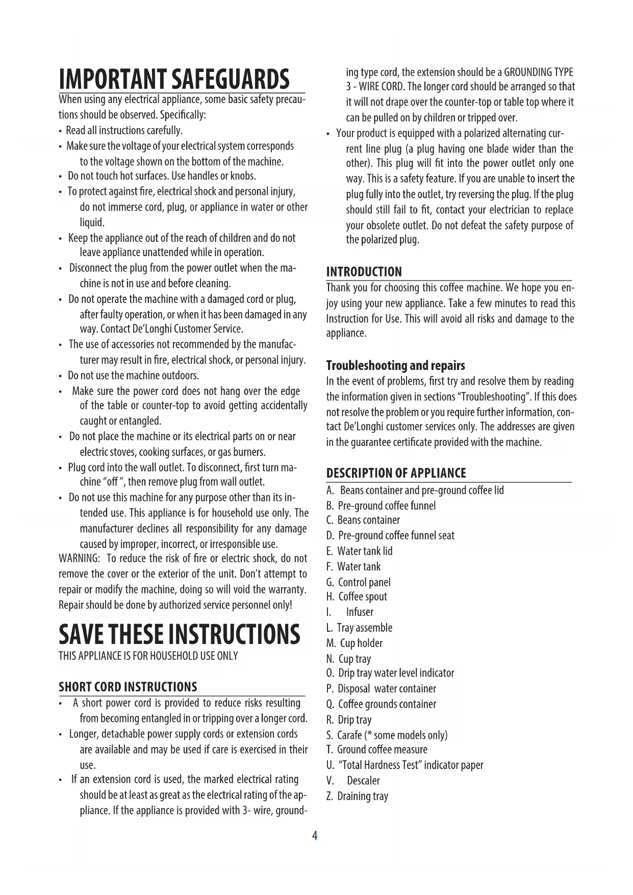 - Your product is equipped with a polarized alternating cur- rent line plug (a plug having one blade wider than the other). This plug will t into the power outlet only one way. This is a safety feature. If you are unable to insert the plug fully into the outlet, try reversing the plug. If the plug should still fail to t, contact your electrician to replace your obsolete outlet. Do not defeat the safety purpose of the polarized plug. INTRODUCTION Thank you for choosing this coee machine. We hope you en- joy using your new appliance. Take a few minutes to read this Instruction for Use. This will avoid all risks and damage to the appliance. Troubleshooting and repairs In the event of problems, rst try and resolve them by reading the information given in sections “Troubleshooting”. If this does not resolve the problem or you require further information, con- tact De’Longhi customer services only. The addresses are given in the guarantee certicate provided with the machine.