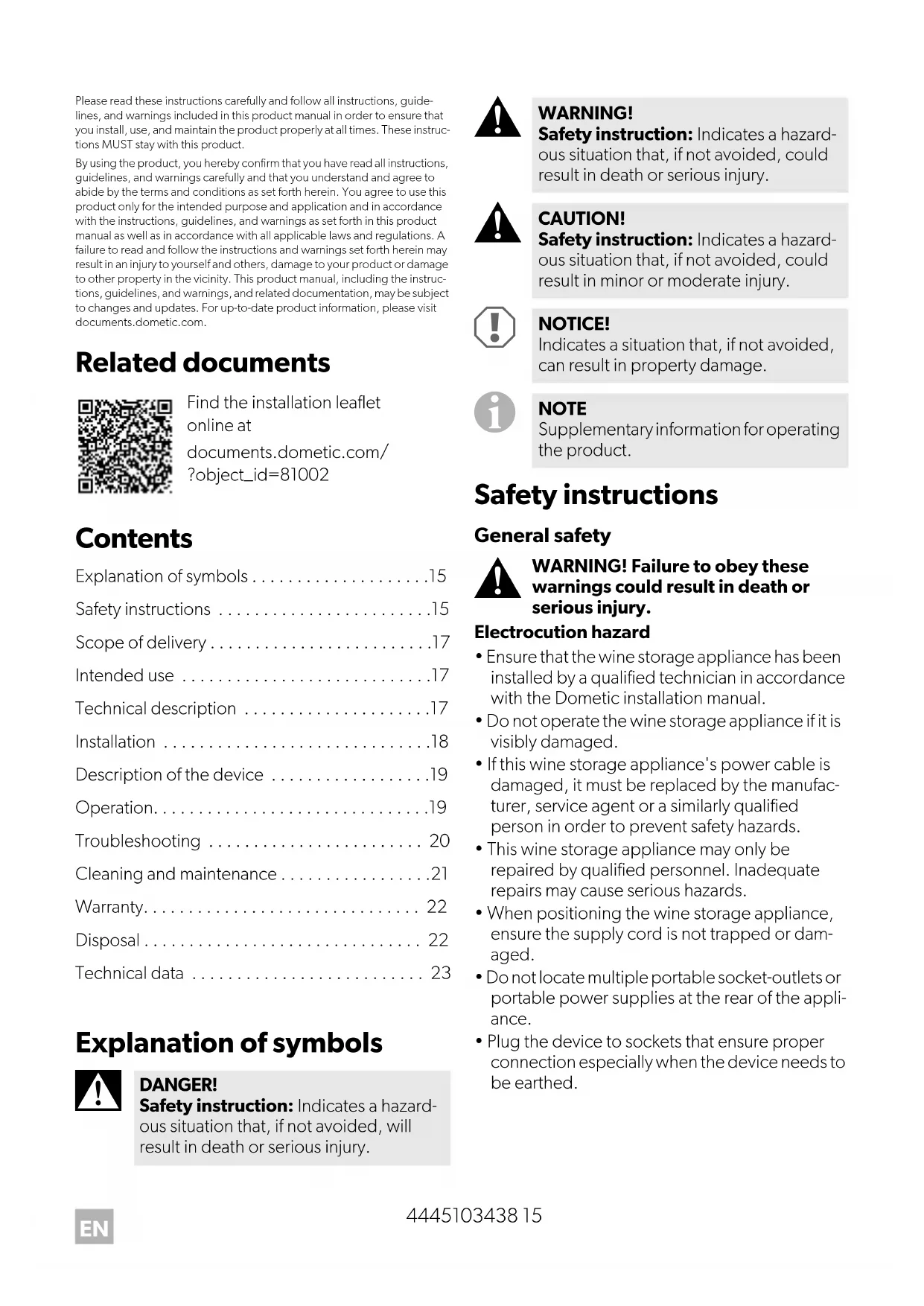 - Plug the device to sockets that ensure proper connection especially when the device needs to be earthed. Find the installation leaflet online at documents.dometic.com/ ?object_id=81002 DANGER! Safety instruction: Indicates a hazard- ous situation that, if not avoided, will result in death or serious injury. WARNING! Safety instruction: Indicates a hazard- ous situation that, if not avoided, could result in death or serious injury. CAUTION! Safety instruction: Indicates a hazard- ous situation that, if not avoided, could result in minor or moderate injury. NOTICE! Indicates a situation that, if not avoided, can result in property damage. NOTE Supplementary information for operating the product.16 4445103438