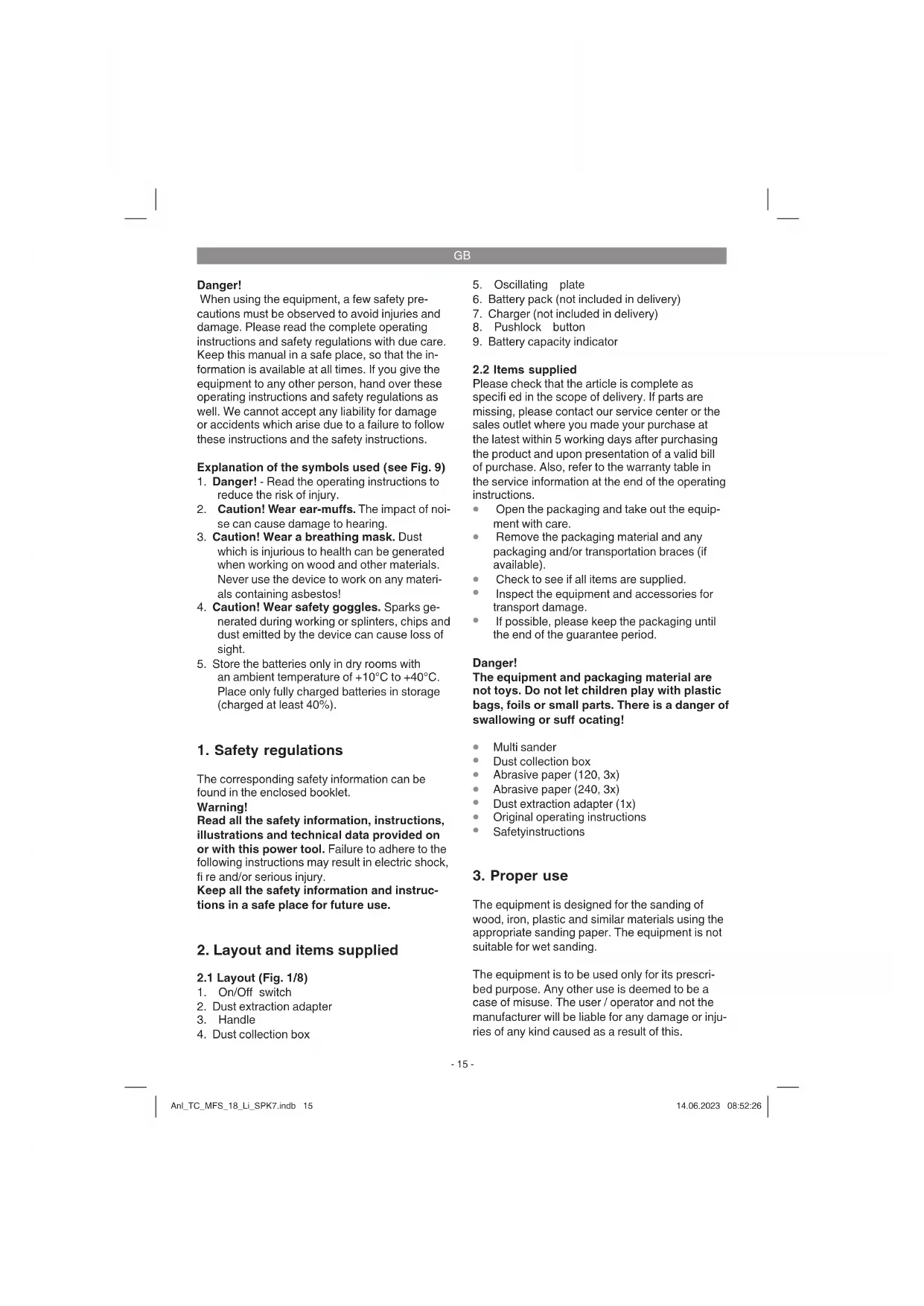 The equipment is designed for the sanding of wood, iron, plastic and similar materials using the appropriate sanding paper. The equipment is not suitable for wet sanding. The equipment is to be used only for its prescri- bed purpose. Any other use is deemed to be a case of misuse. The user / operator and not the manufacturer will be liable for any damage or inju- ries of any kind caused as a result of this. Anl_TC_MFS_18_Li_SPK7.indb 15Anl_TC_MFS_18_Li_SPK7.indb 15 14.06.2023 08:52:2614.06.2023 08:52:26GB